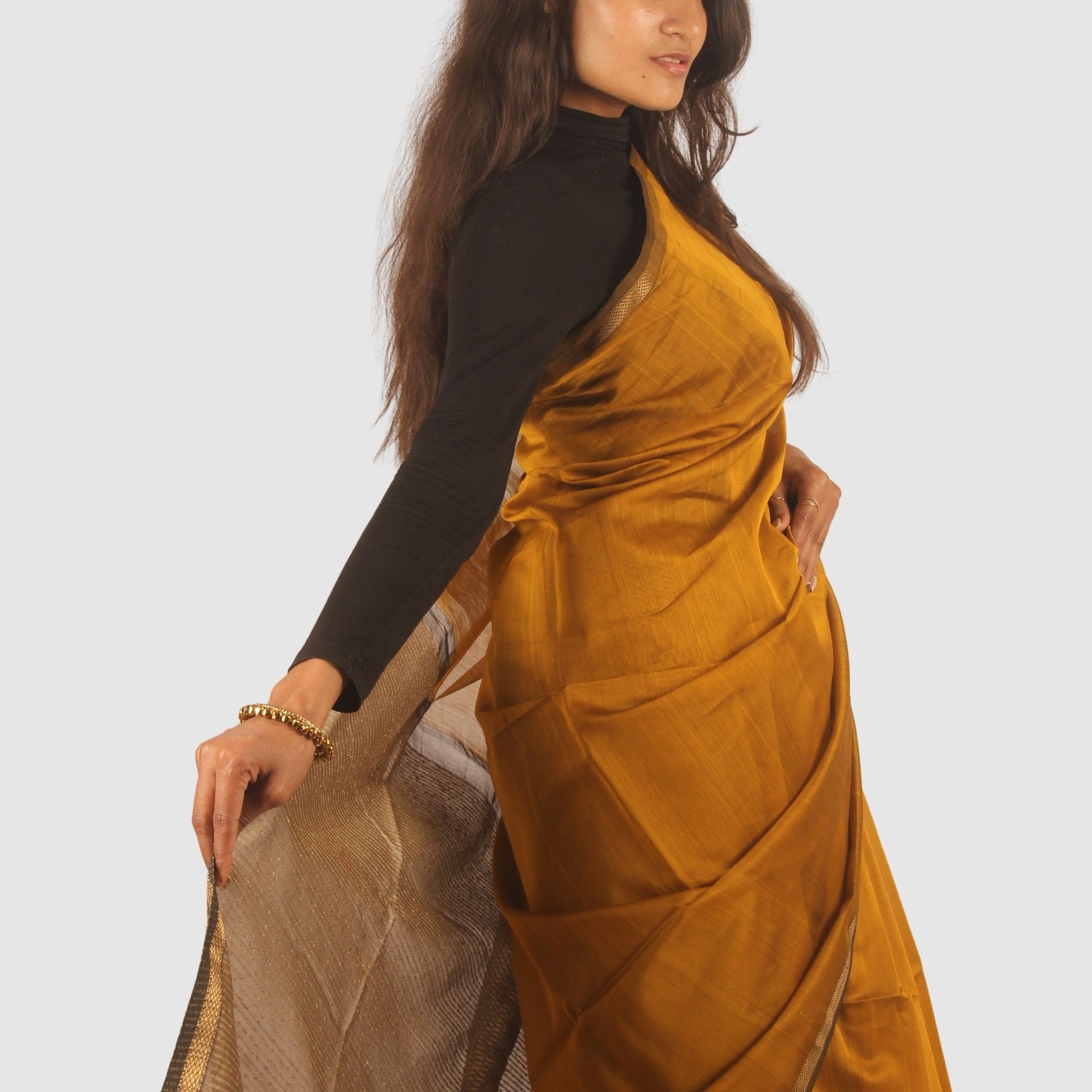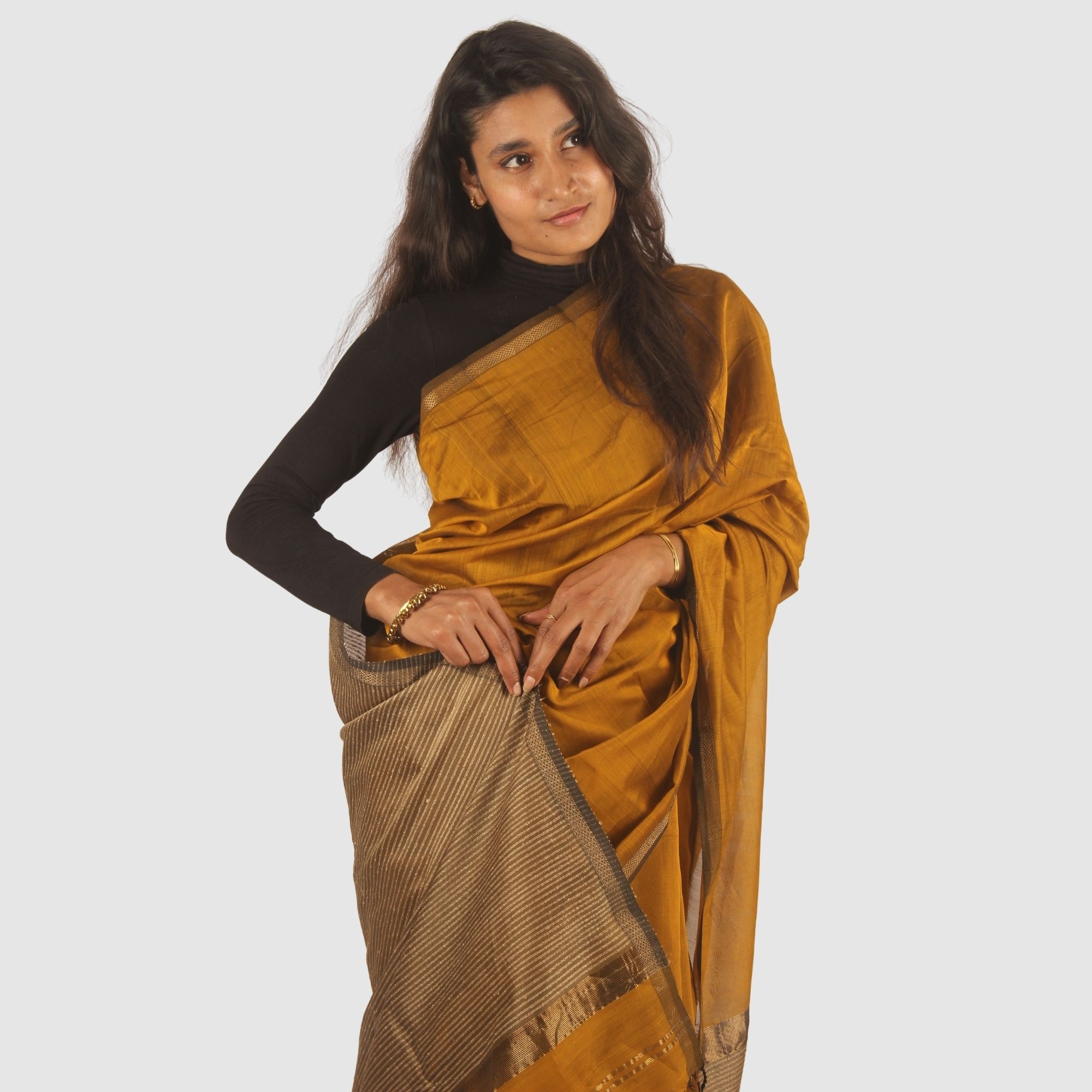 This elegant Maheshwari handloom saree is carefully woven by skilled artisans in Maheshwar, Madhya Pradesh. Designed in a rich mustard gold tone, the saree features a subtle natural sheen and a timeless classic zari border that enhances its graceful appeal.