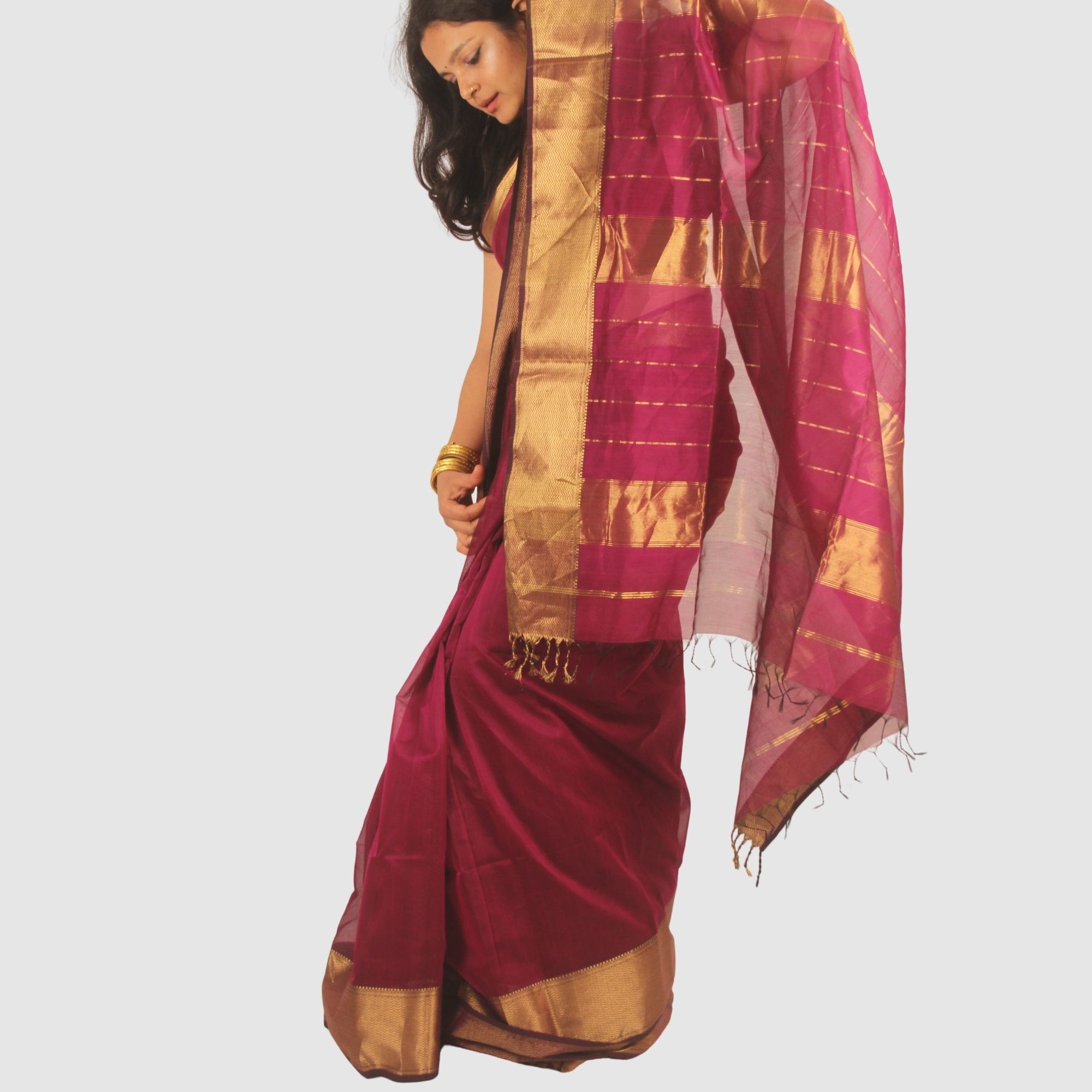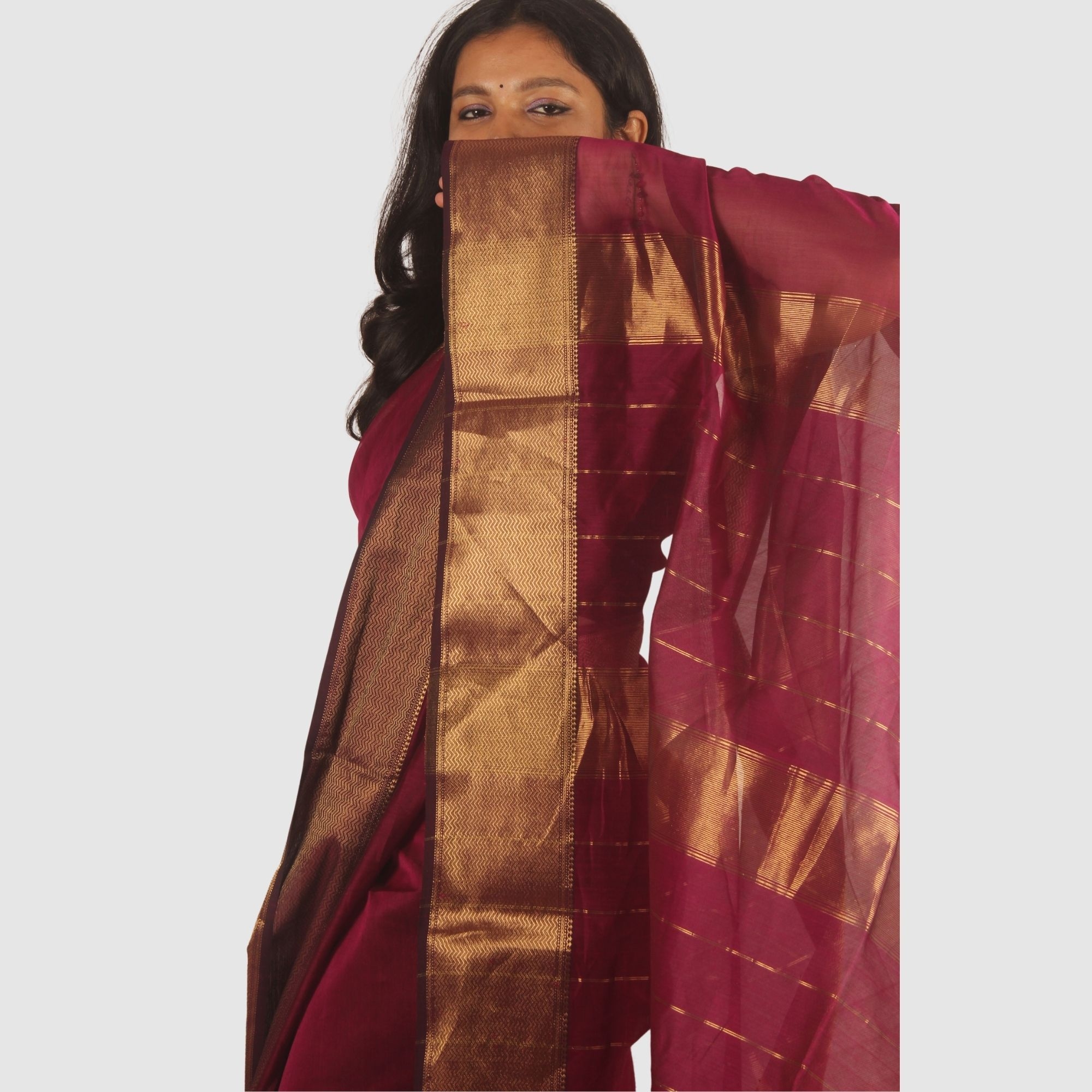 This elegant Maheshwari handloom saree is meticulously woven by skilled artisans in Maheshwar, Madhya Pradesh. Designed in a graceful wine maroon shade, the saree features a timeless antique gold zari border that enhances its traditional charm.