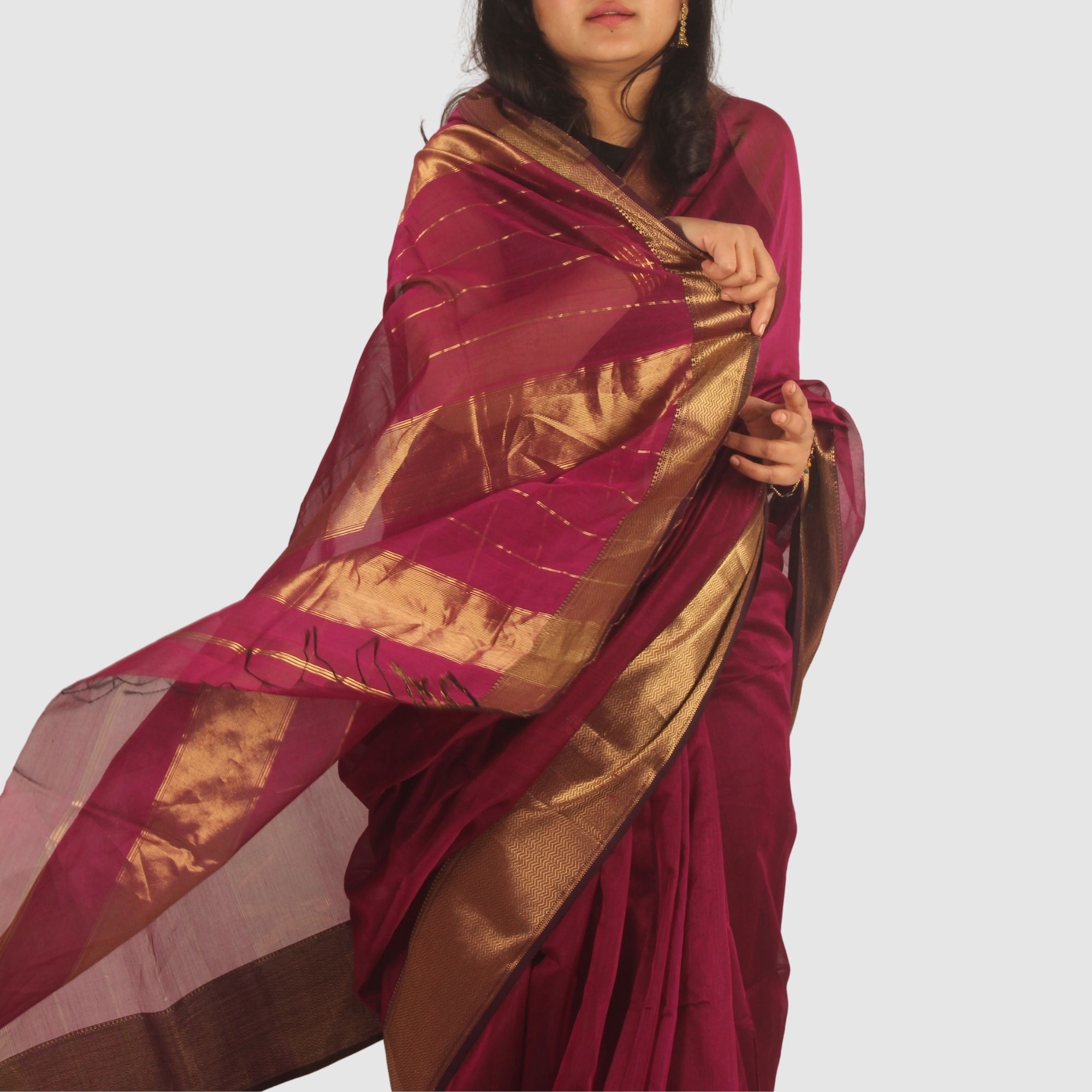 Elegant Wine Maroon Maheshwari Handloom Silk Cotton Saree with Gold Zari Border