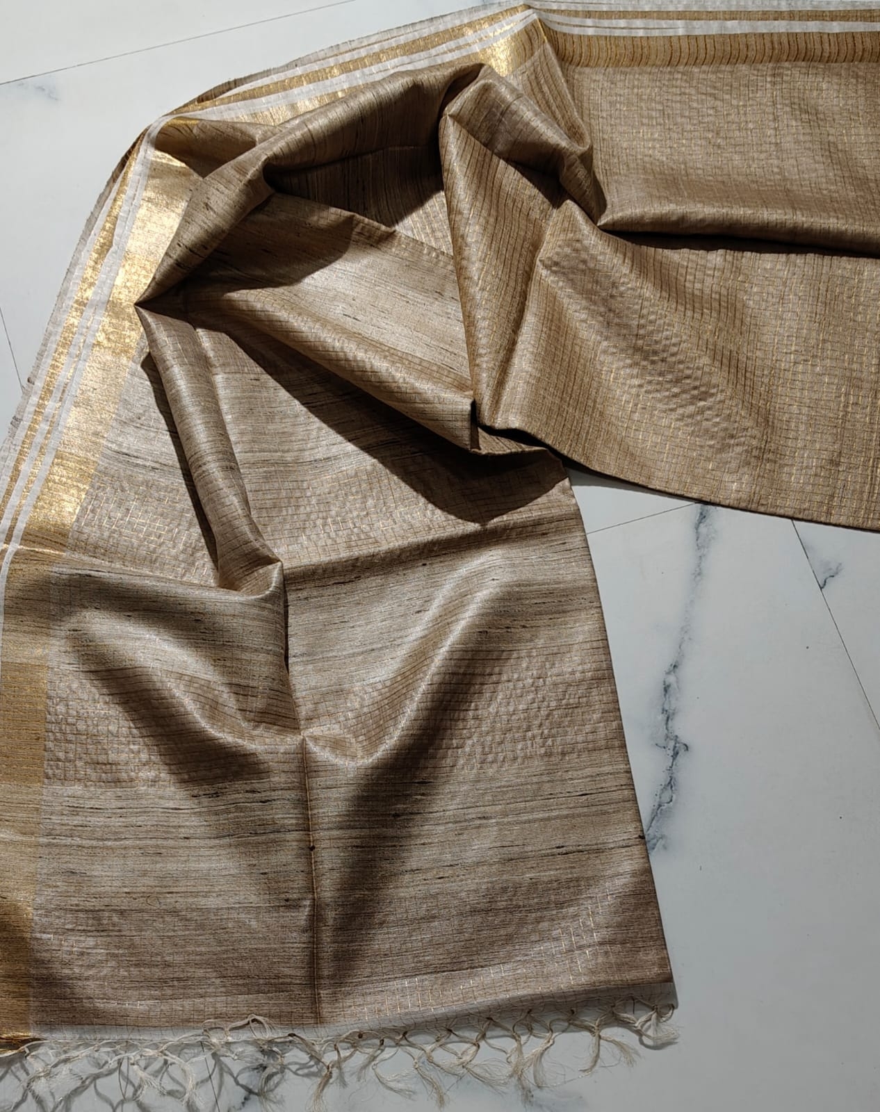 Indulge in timeless elegance with our Elysia Kosa – a beautifully handcrafted pure Kosa silk saree collection made from premium Malbari Deshi Silk. Dyed naturally and adorned with intricate jari small chake motifs, this saree radiates heritage charm and contemporary grace.