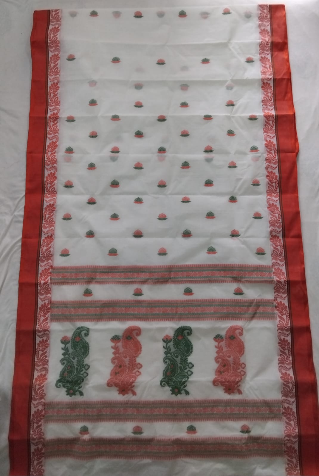 Cotton saree is made by fine cotton count embellished by extra warp designs with multi coloured yarns. It is a simple formation of cotton saree & woven with figured motifs, in transparent plain ground, with designs of extra warp in borders and extra weft in the body. Use of cotton yarn make it suitable to wear comfortably.