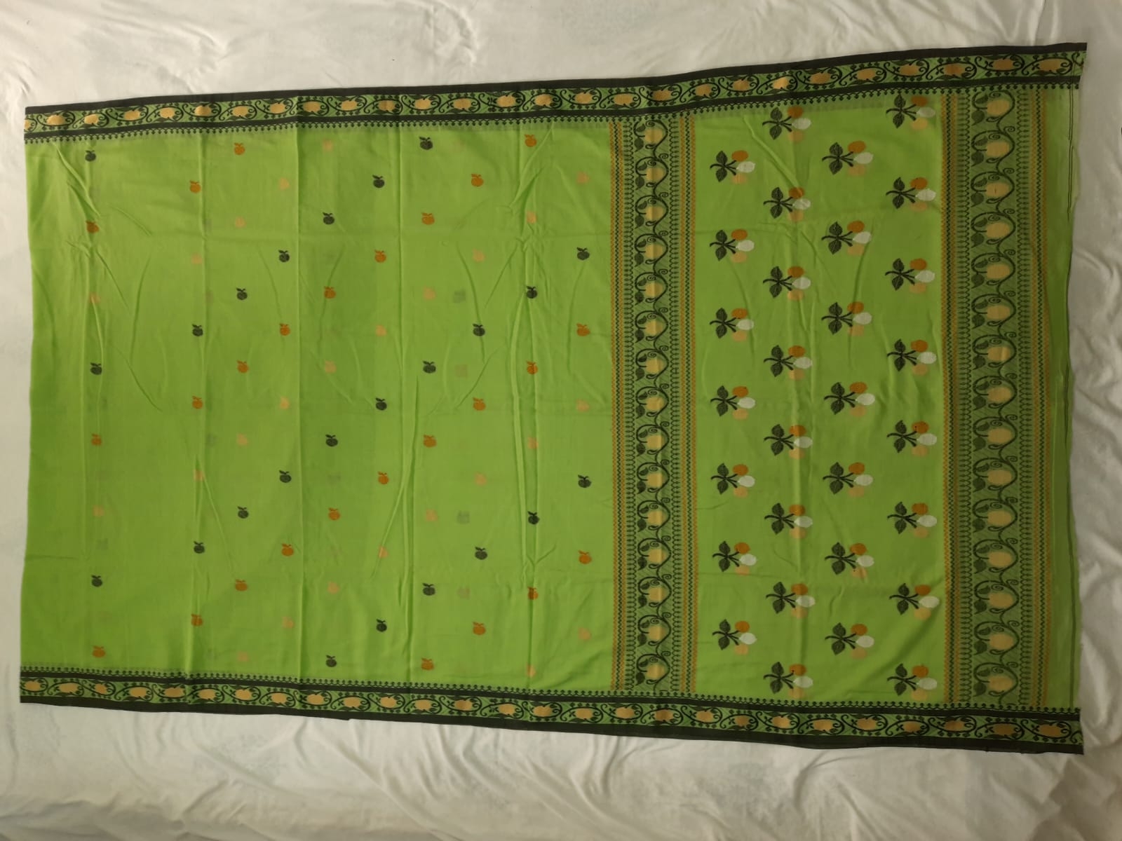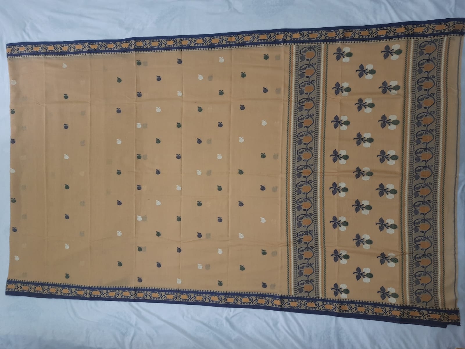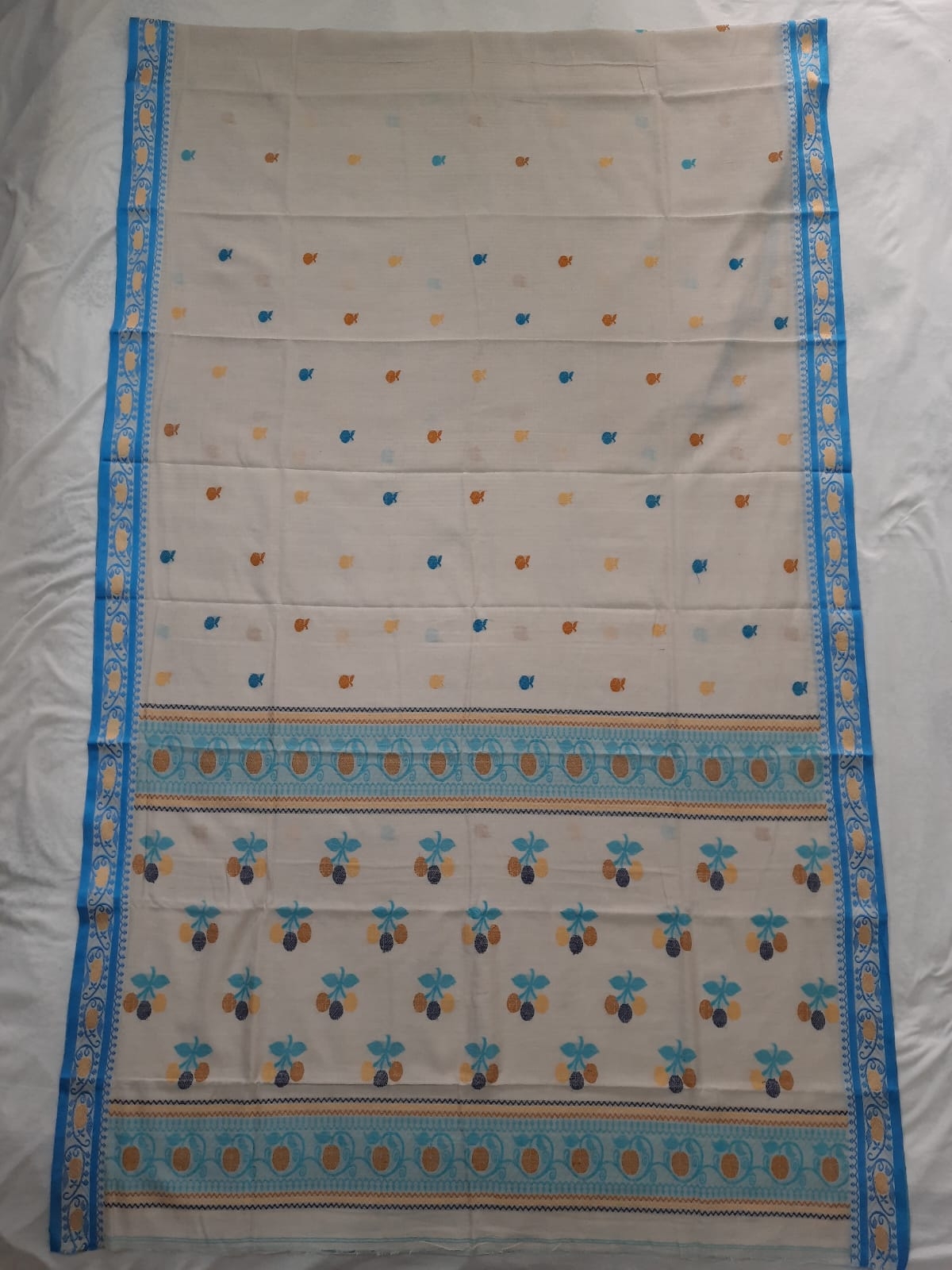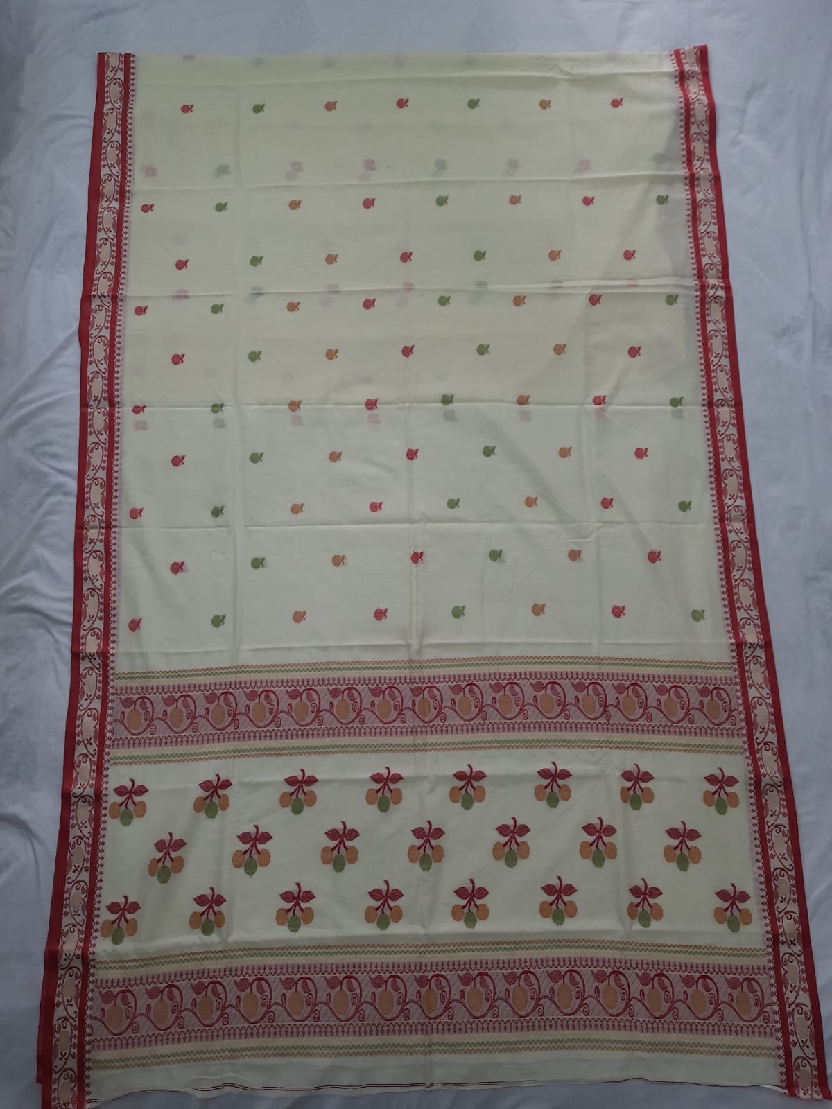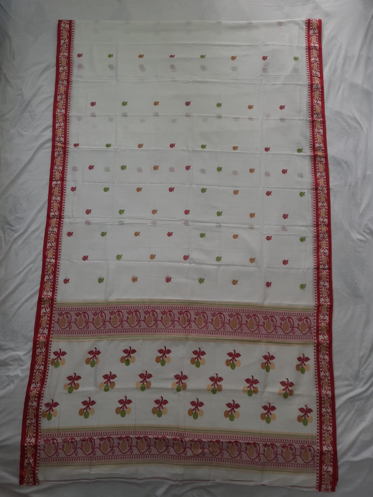 Tangail saree is made by fine cotton count embellished by extra warp designs with multi coloured yarns. It is a simple formation of Jamdani cotton saree & woven with figured motifs, in transparent plain ground, with designs of extra warp in borders and extra weft in the body. Use of cotton yarn make it suitable to wear comfortably.