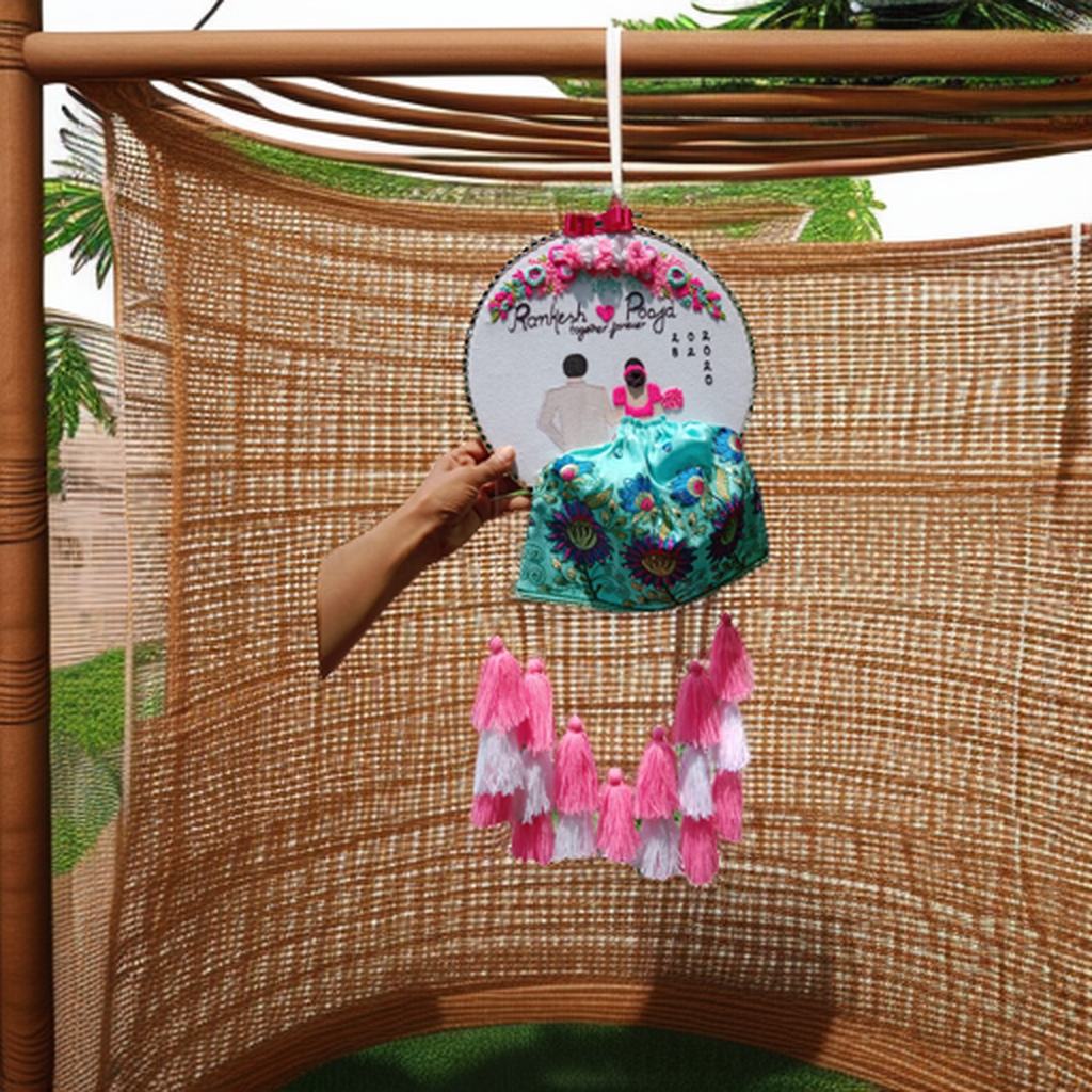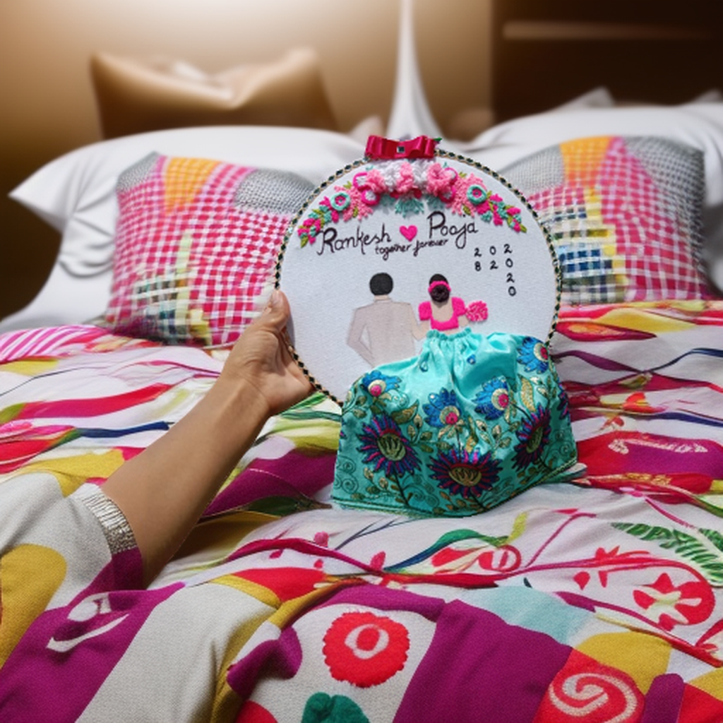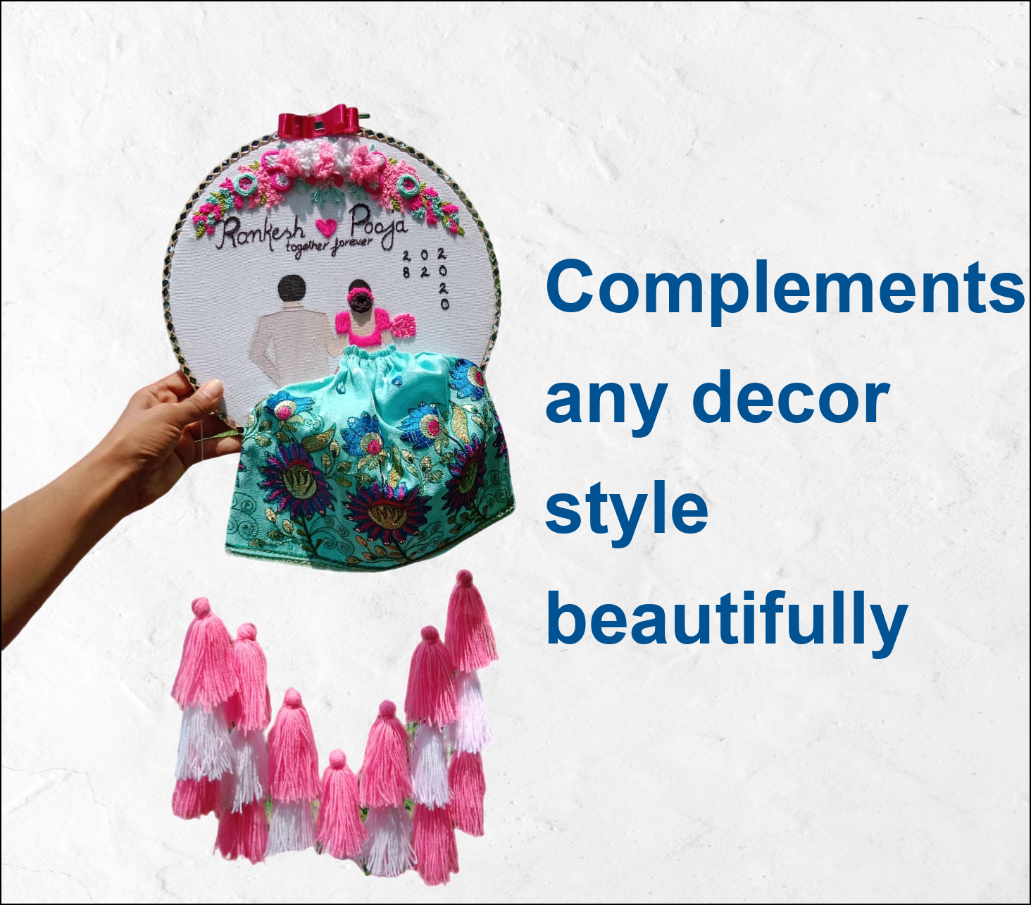 Celebrate your special moments with our stunning 10-inch Moodle Wedding Frame, meticulously crafted using high-quality woolen materials. This exquisite frame features a beautifully designed lehenga made from premium fabric and paint, enhanced with vibrant poster colors. The intricate laces, also made of wool, add a touch of elegance, while the glass encasement ensures durability and a polished finish. Complete with a decorative ribbon, this frame is perfect for showcasing your cherished wedding memories. Ideal for all users looking to add a unique touch to their home decor or gift a loved one on their special day.