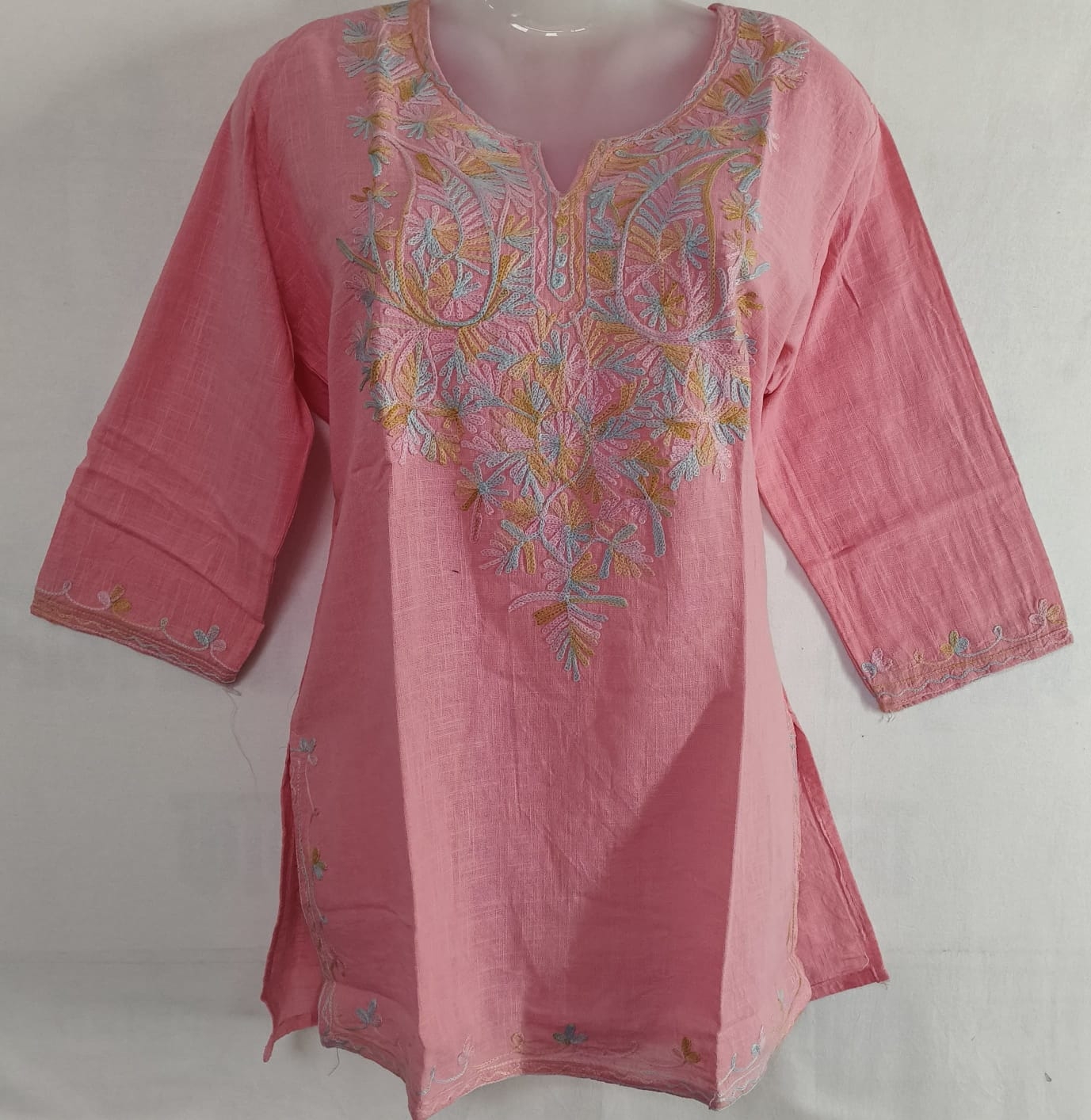 This elegant pink cotton-linen kurti features intricate multicolor Chikankari embroidery with floral and paisley patterns. Designed with a stylish V-notch round neckline and 3/4th sleeves, it offers a comfortable fit—perfect for casual, office, or ethnic wear.