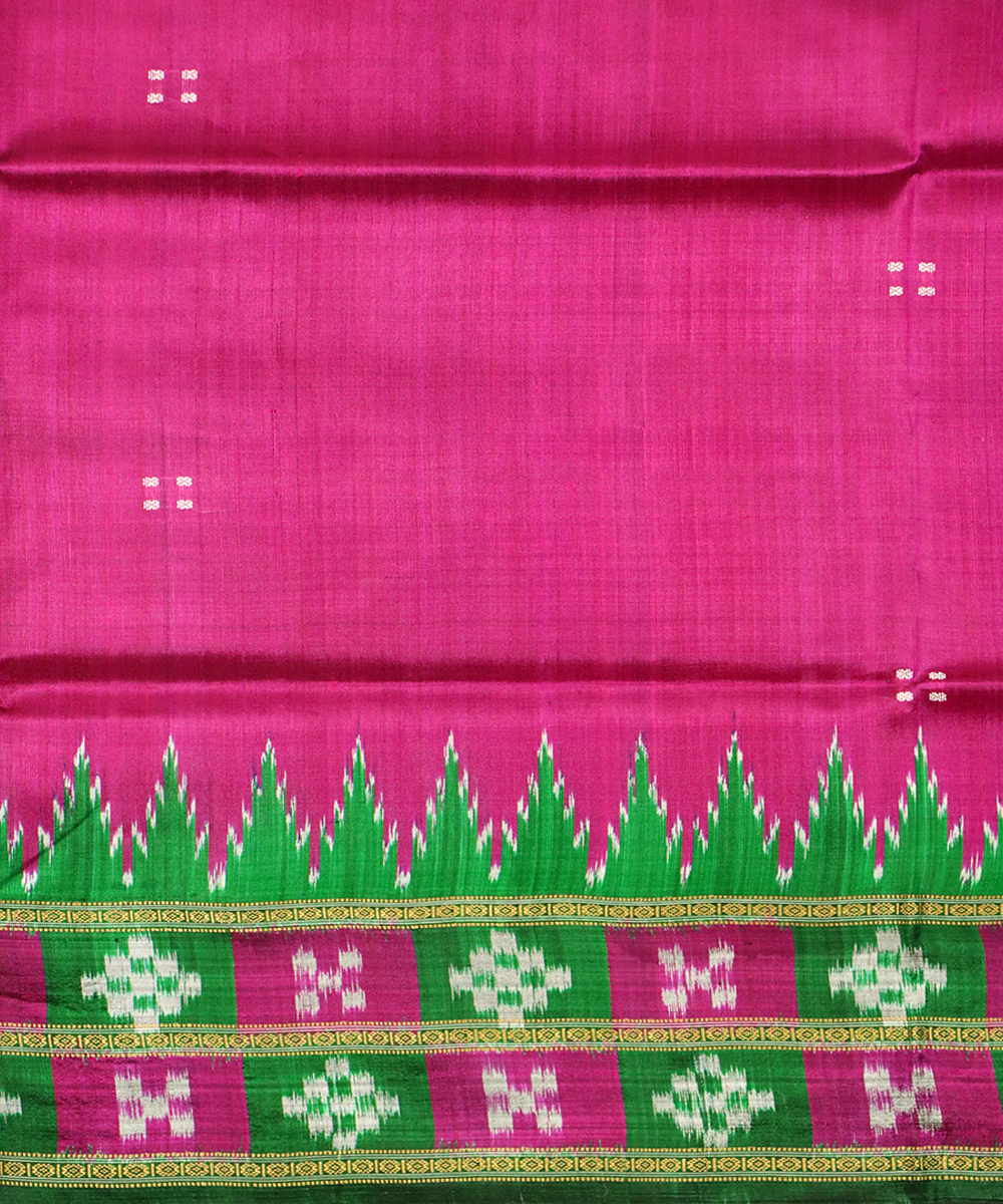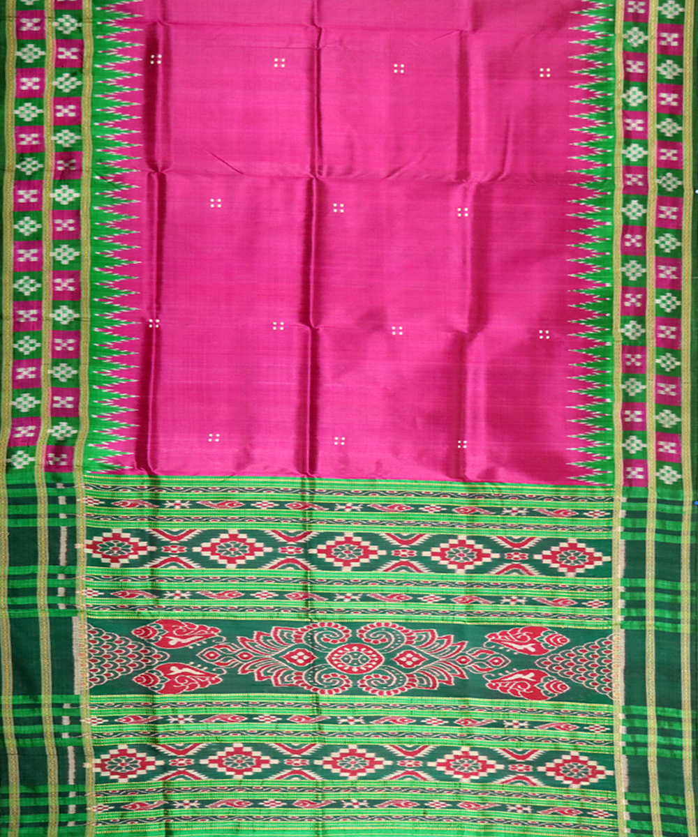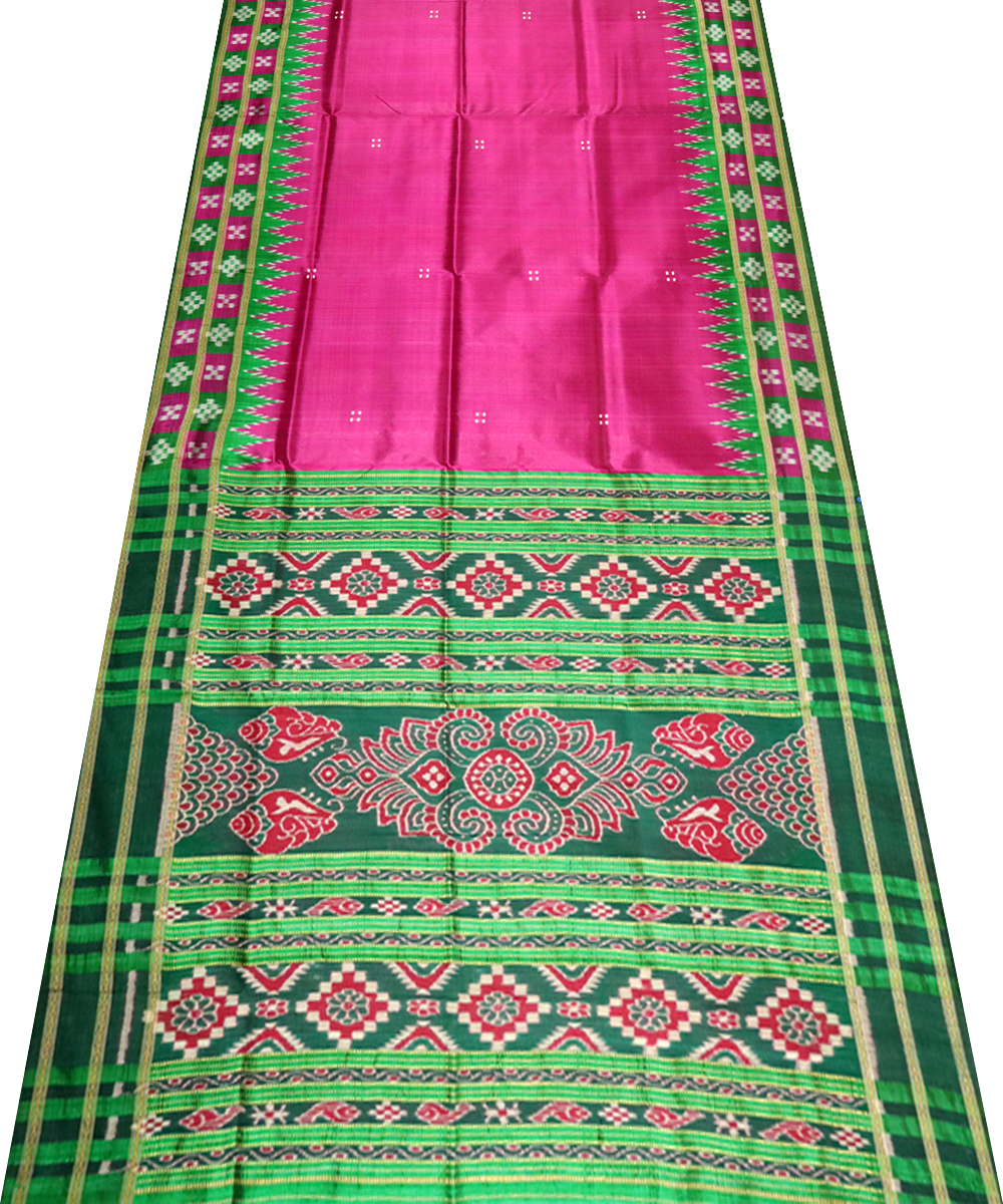 Handwoven traditional Khandua silk saree Flirt base with butta in body & border multi colour base with pasapali & temple ikat & rudraksha dobby & Pallu bottle green base with traditional ikat