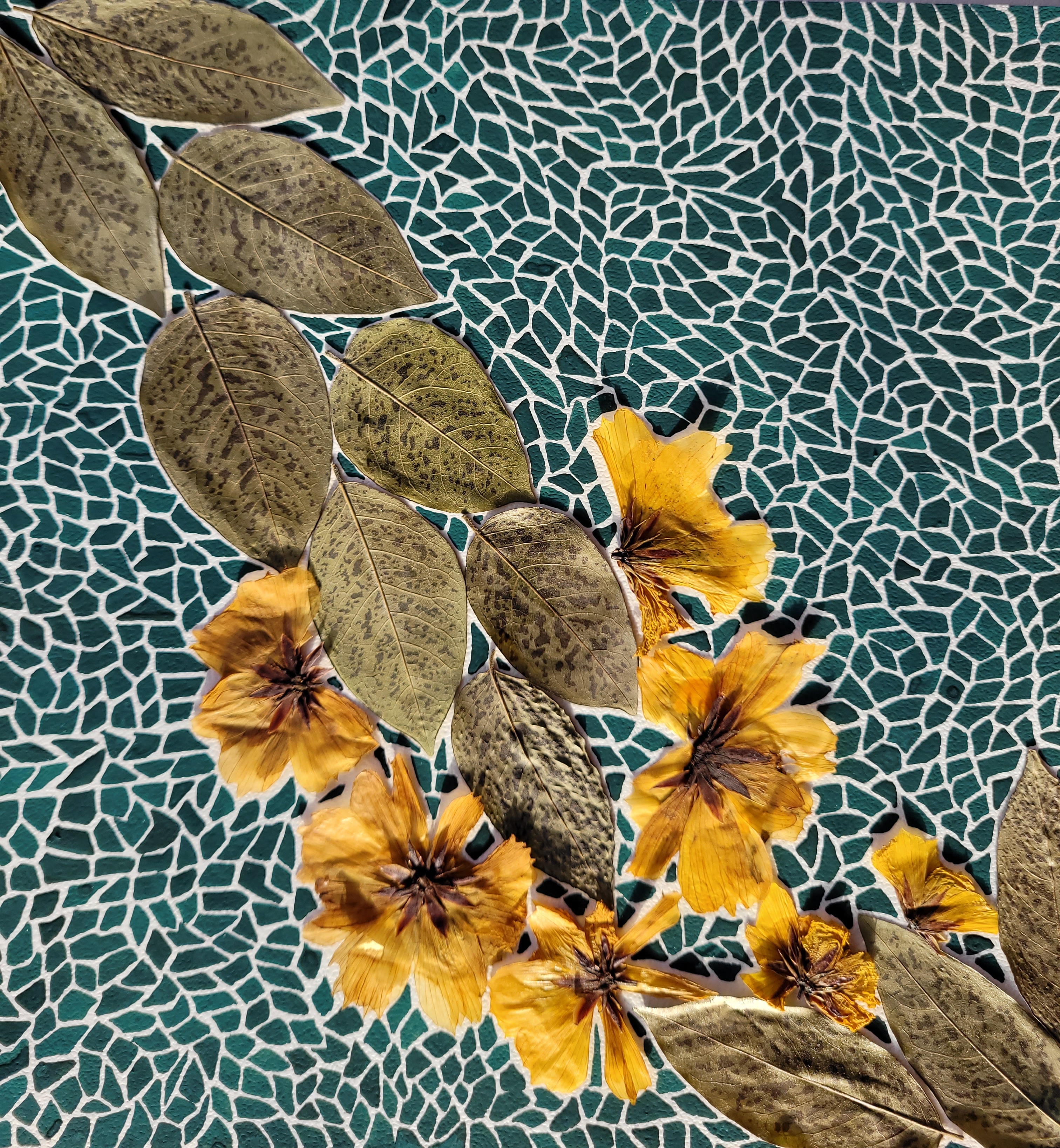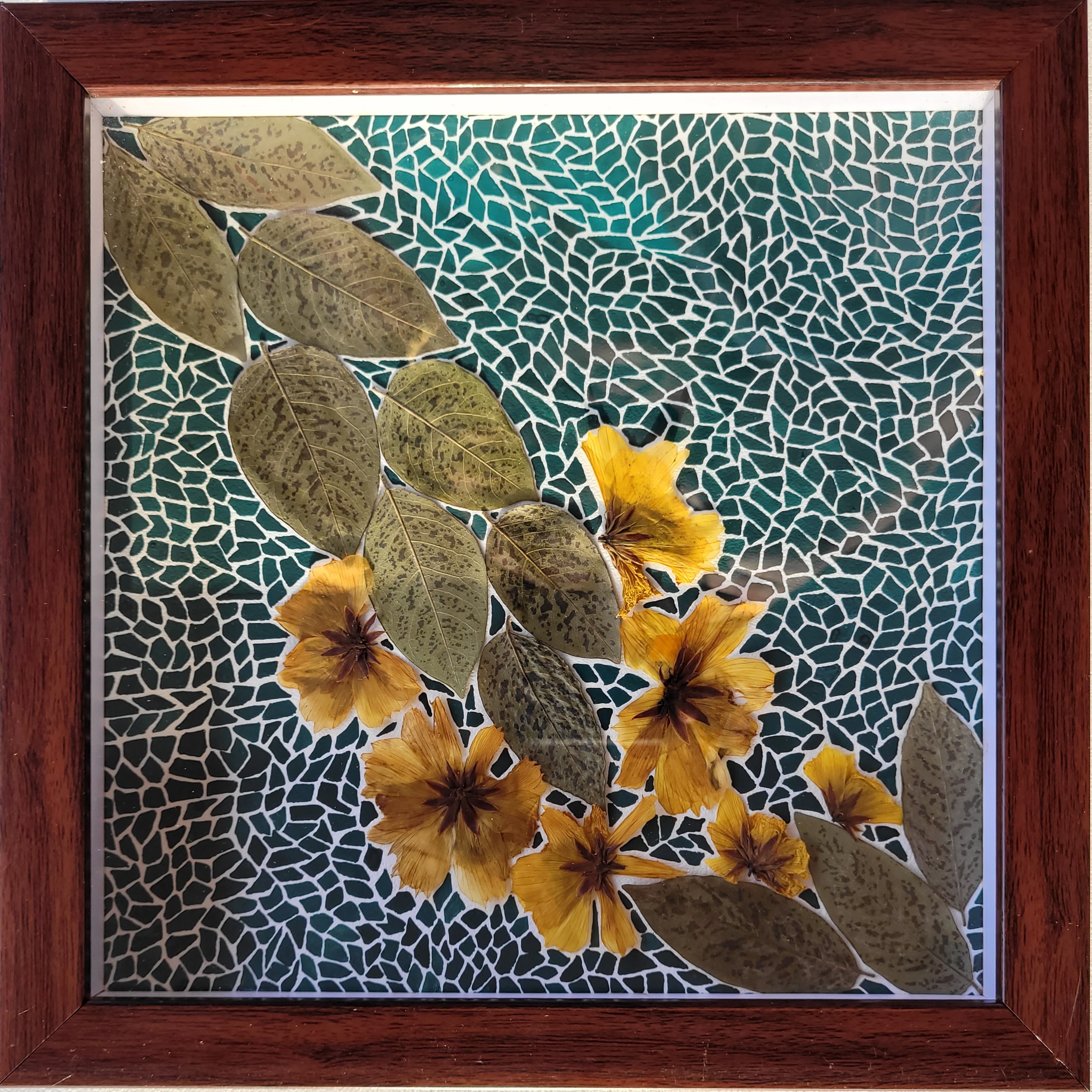 This authentic artwork is done by using dry leaves and flowers. A lot of research work has been done on drying techniques. If you observe the artwork carefully, you can appreciate that none of the leaves and flowers are shaped or manipulated. To get an aesthetic sense, mosaic art has been done using poster colours. Good quality paper, poster colour painting and frame have been used. Buy now. In stock. Free delivery.