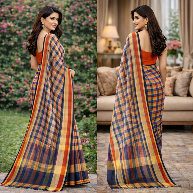 Gamcha saree, with Blouse and check pattern of blue & Orange
