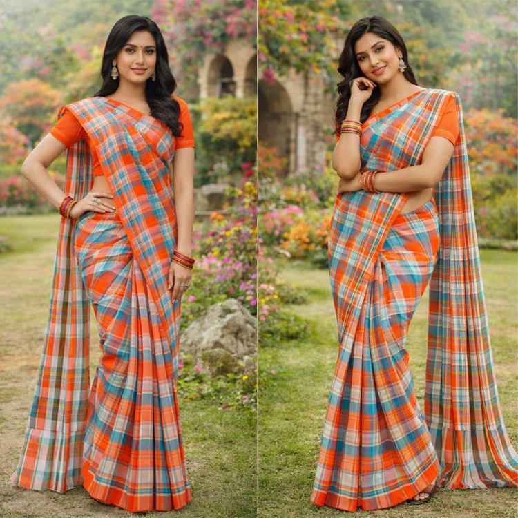 Gamcha saree with Blouse, check pattern with multi color yarn
