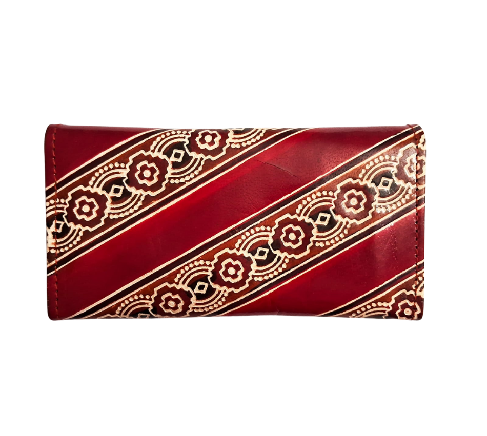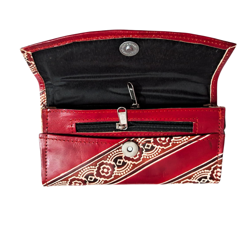 This purse is a classic example of age old Shantiniketan craft. It was introduced in West Bengal, India during the 1940s. The traditional motifs used for These Shantiniketan bags depict the rich cultural heritage of India. It derives its name from the place where it was first introduced – Shantiniketan. The Shantiniketan style evolved as a result of the Art Movement. These products have now become world famous for their applique, batik and embossed craft work. Moreover the process of burnishing the leather gives it an elegant sheen and brings out the colors. The embossing craft is an intricate process. After the final leather is made, it is then stitched into the desired product . Finally the product is coated with a lacquer finish for making the product shiny and long lasting.