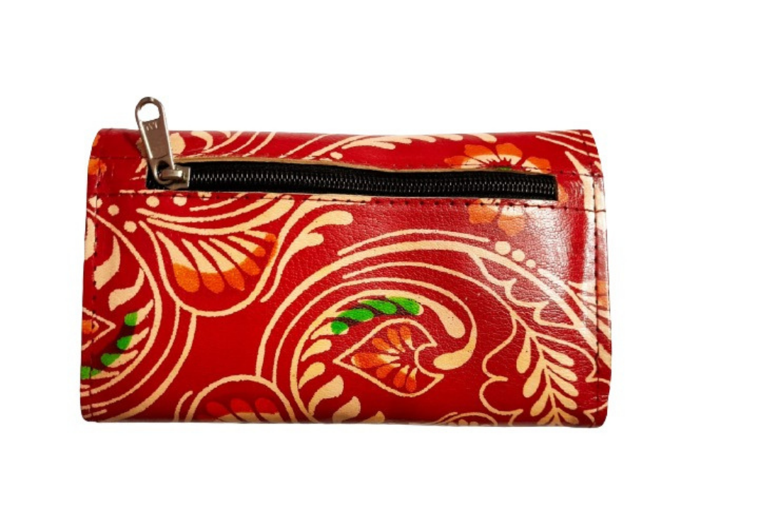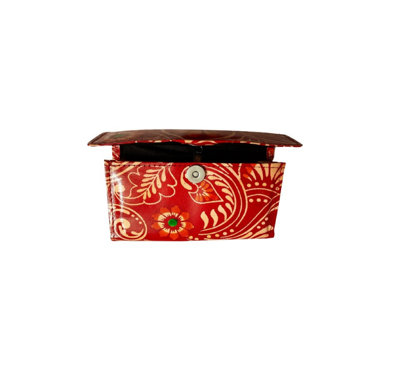This purse is a classic example of age old Shantiniketan craft. It was introduced in West Bengal, India during the 1940s. The traditional motifs used for These Shantiniketan bags depict the rich cultural heritage of India. It derives its name from the place where it was first introduced – Shantiniketan. The Shantiniketan style evolved as a result of the Art Movement. These products have now become world famous for their applique, batik and embossed craft work. Moreover the process of burnishing the leather gives it an elegant sheen and brings out the colors. The embossing craft is an intricate process. After the final leather is made, it is then stitched into the desired product . Finally the product is coated with a lacquer finish for making the product shiny and long lasting.