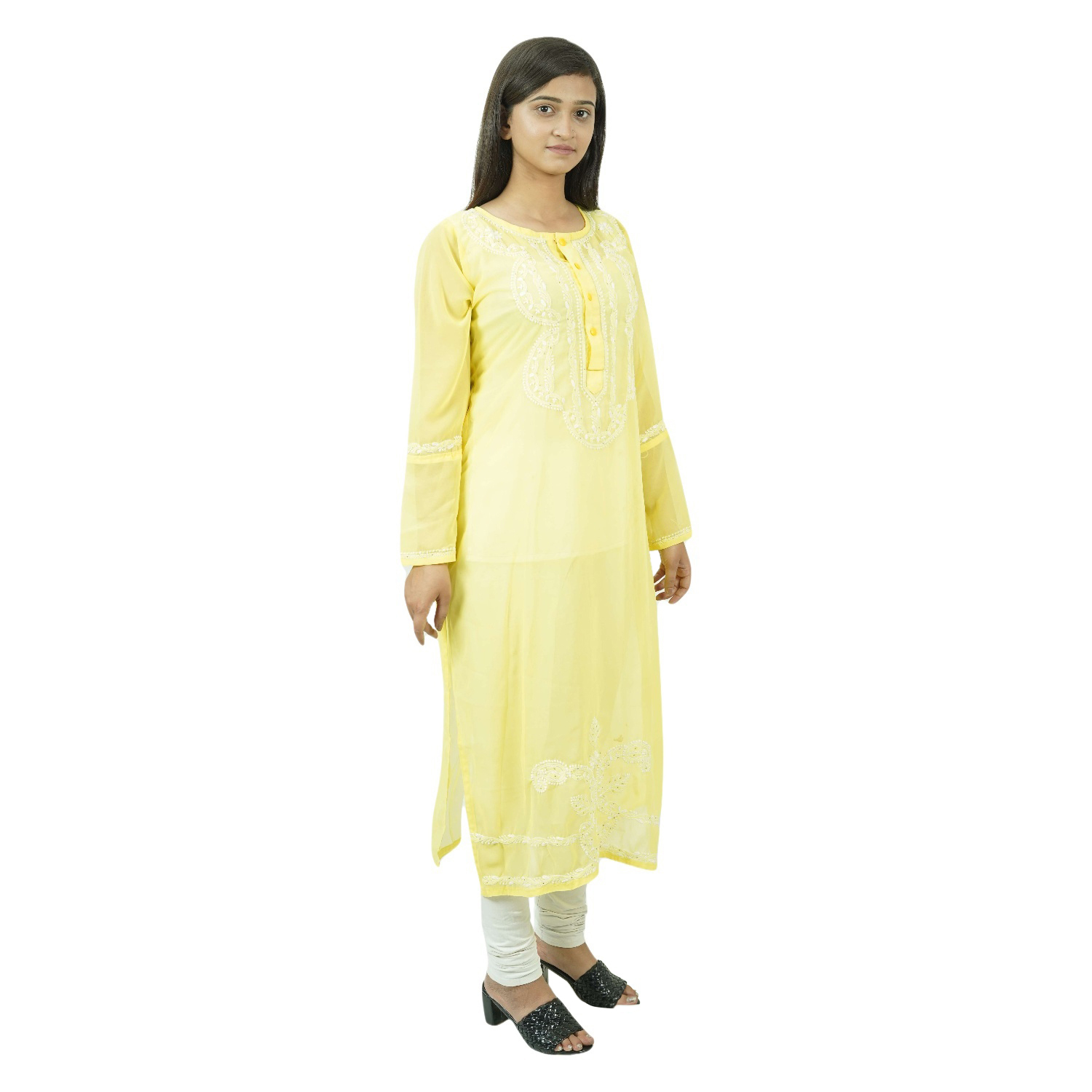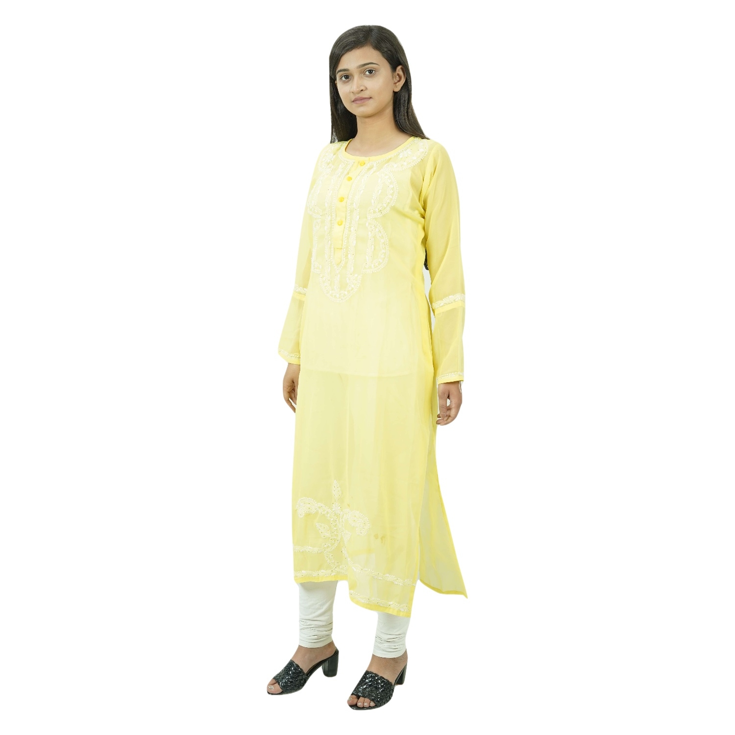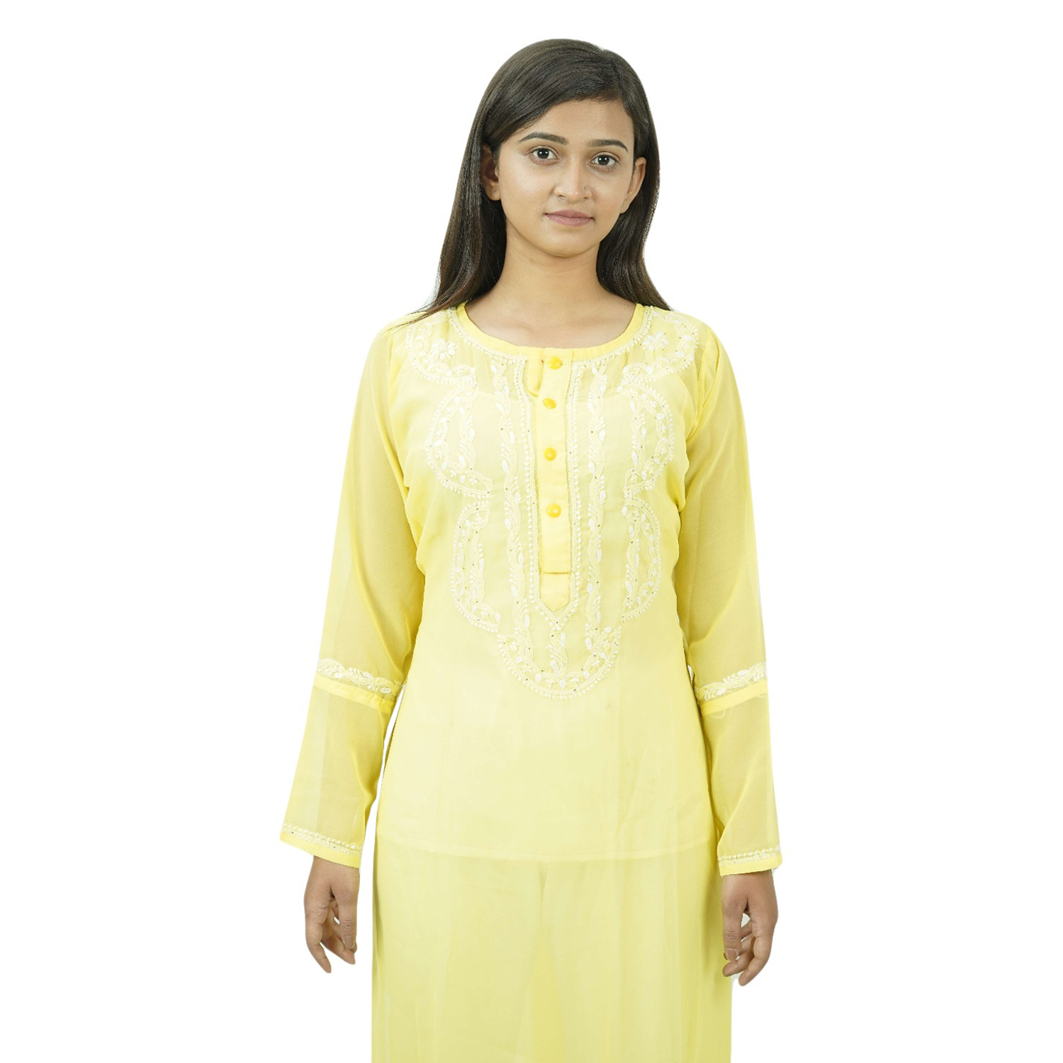 The Yellow Georgette Chikankari Kurti is a beautiful and elegant kurti that is handcrafted in India. It is made from fine-quality cotton and is adorned with delicate floral motifs. The kurti is perfect for any occasion, from a casual day out to a formal event.