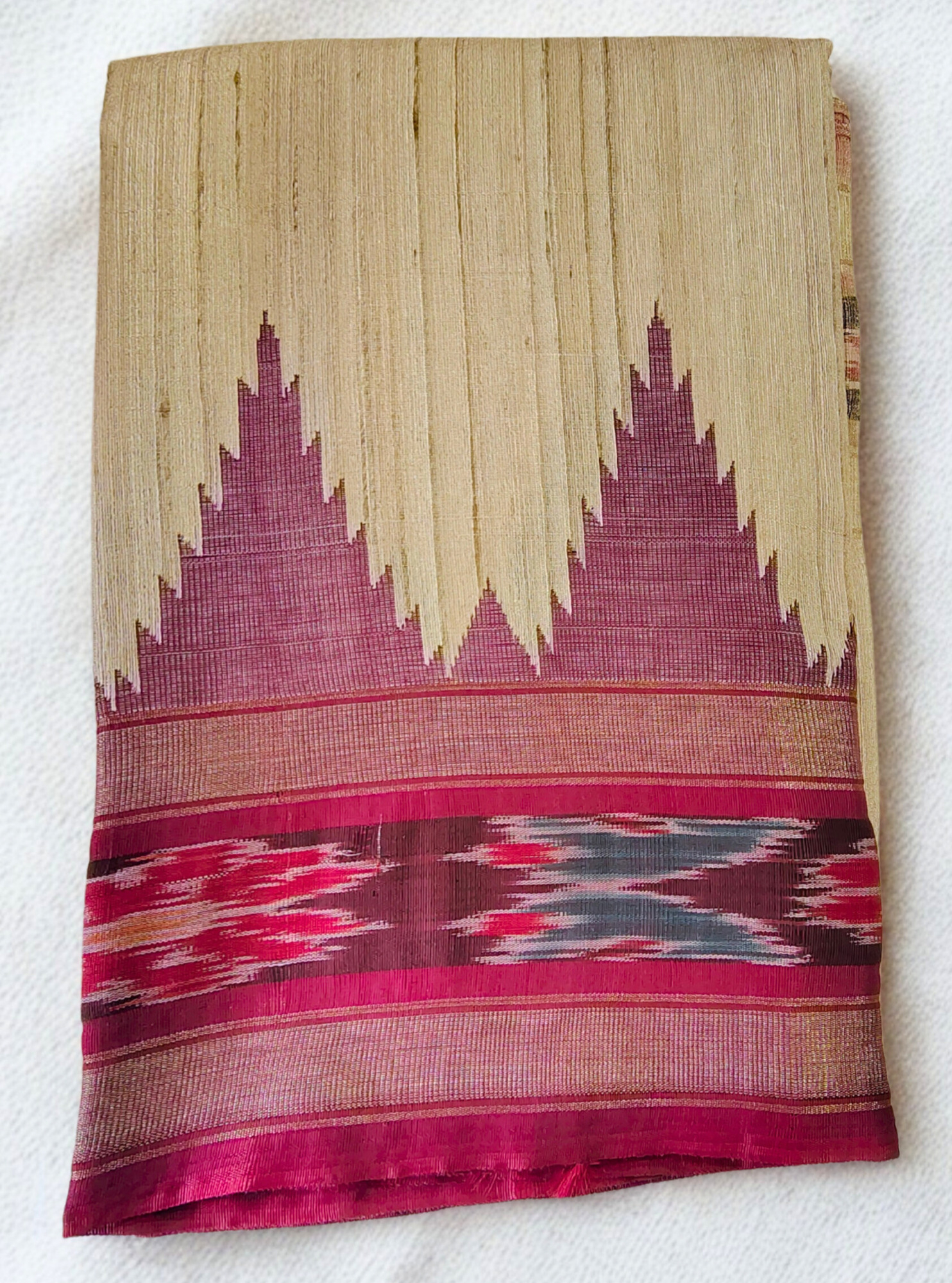 This Gheecha silk saree features a beautifully textured body with a rich maroon border, combining raw elegance with traditional style. Handwoven by artisans, it offers a natural sheen and a graceful drape. Perfect for festive occasions or cultural events, it brings understated luxury and earthy charm to your ethnic wardrobe.