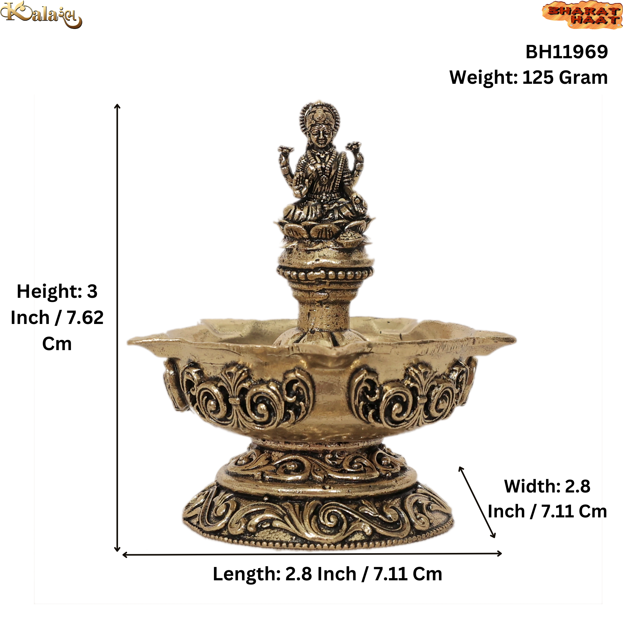 The diya measures 2.8 x 2.8 x 3 inches (7.11 x 7.11 x 7.62 cm) and weighs 125 grams, making it compact, lightweight, and convenient for everyday worship. Its sturdy base ensures stability while lighting oil or ghee lamps during prayers.