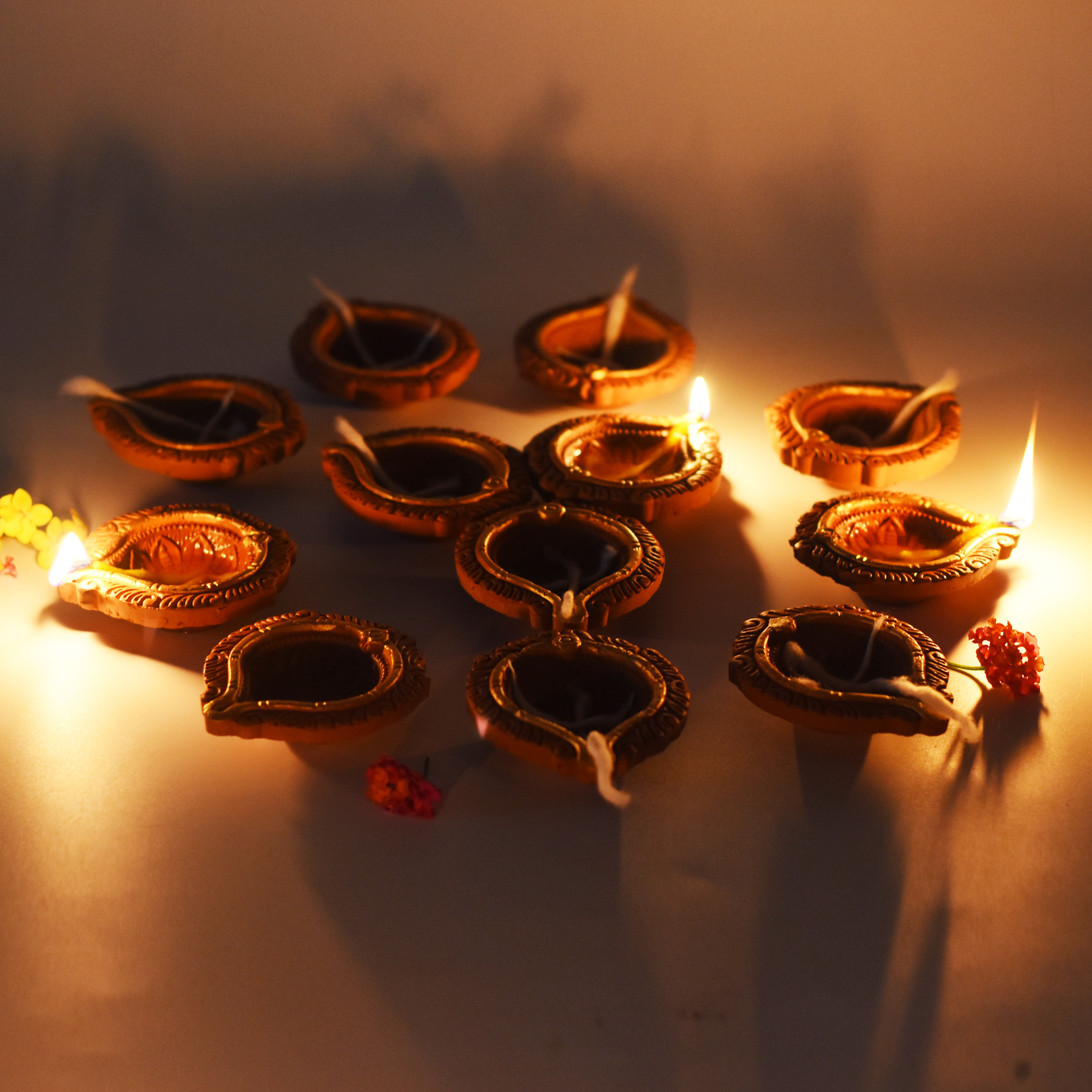 Handcrafted with lot of love & care. This diya is having Indian Motiff Decoration, a perfect gift for this Diwali. The Outer Ring of this diya is gold painted which will add to the celebration and grandeur of your house this Diwali. Festive Special - set of 12 diyas & cotton wicks