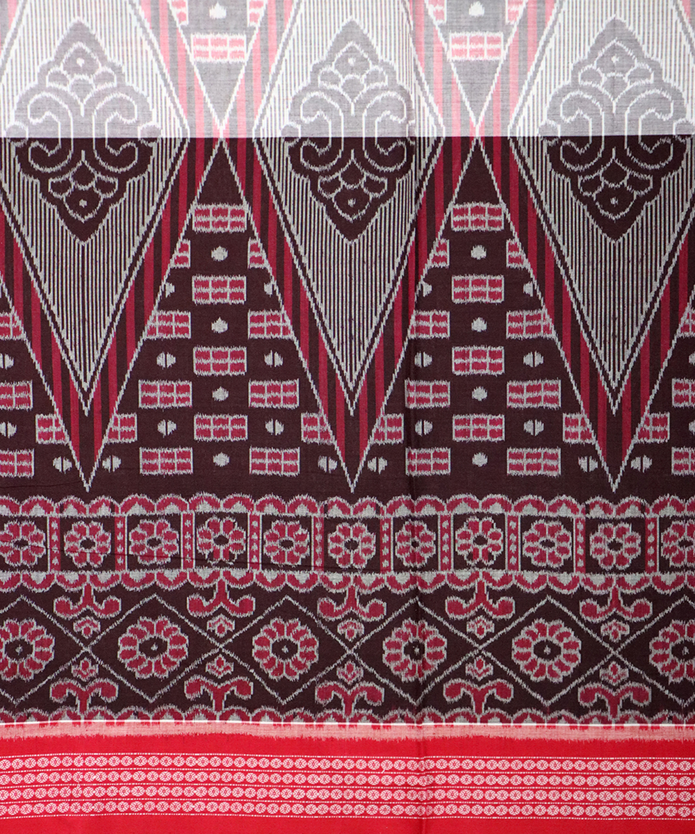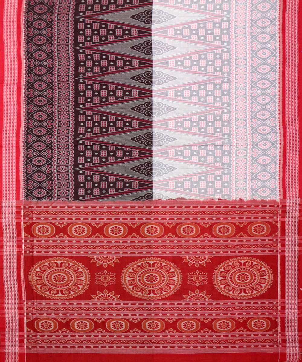 Exclusive Handwoven sambalpuri cotton saree Gray & Black bean base with traditional ikat in body , border dark red base with rudraksha dobby & Pallu dark red base with traditional Ikat, Blouse piece attached with dark red