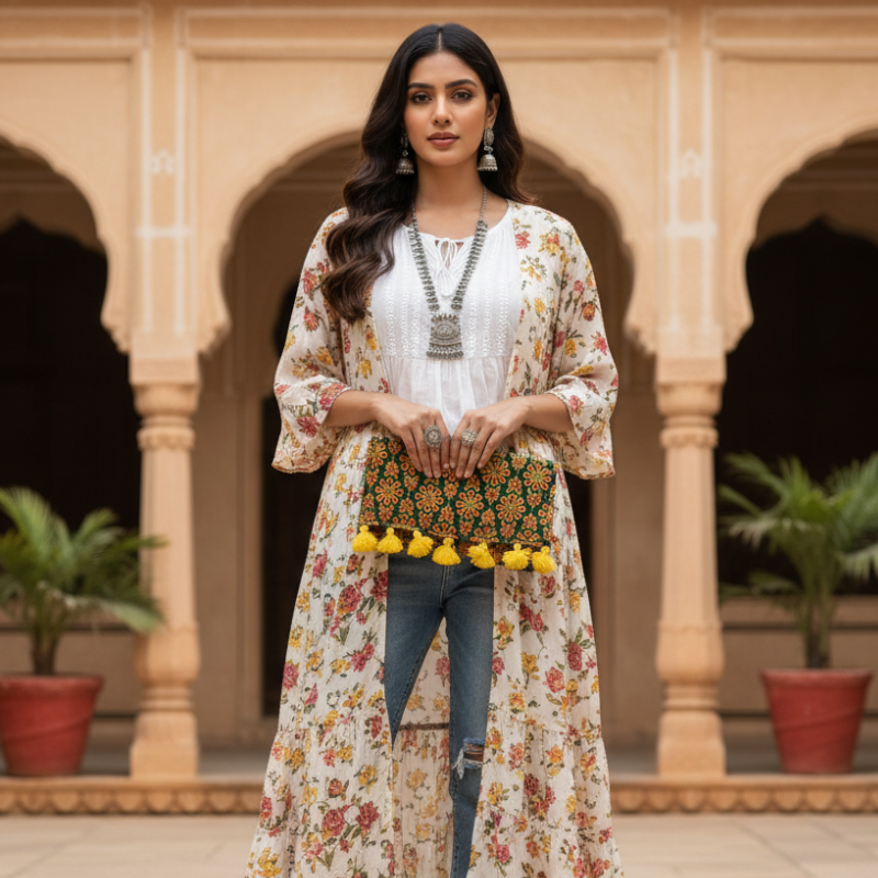 This green and yellow printed clutch with yellow tassels is a compact and stylish accessory for daily use. Designed with a lightweight body and secure closure, it easily holds cash, cards, keys, lip balm, and other small essentials. The bright printed motifs and tassel detailing add a lively touch, making it perfect for casual outings, errands, travel, or gifting. Its handy size makes it easy to slip inside a tote or carry on its own.
