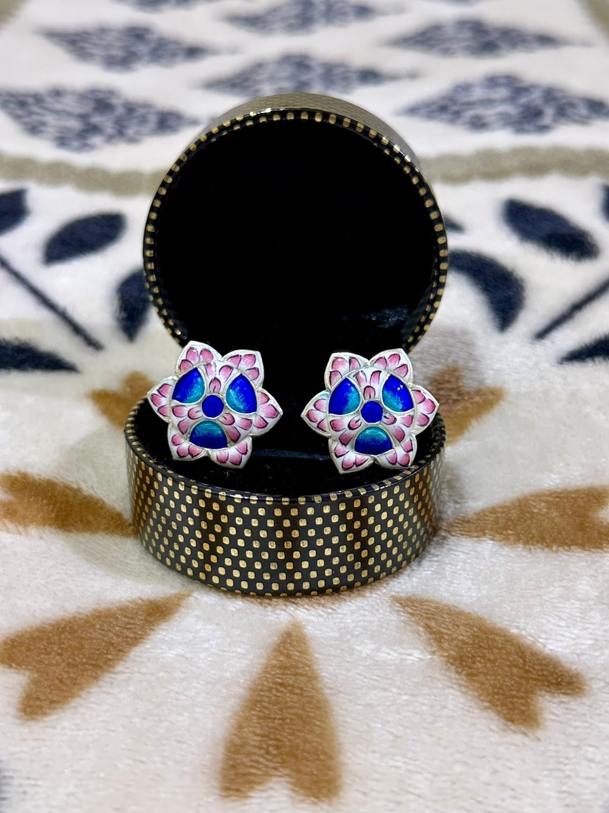 | Material | Gulabi meenakri (Blue enamelling on 925 silver plate base), Stainless steel |