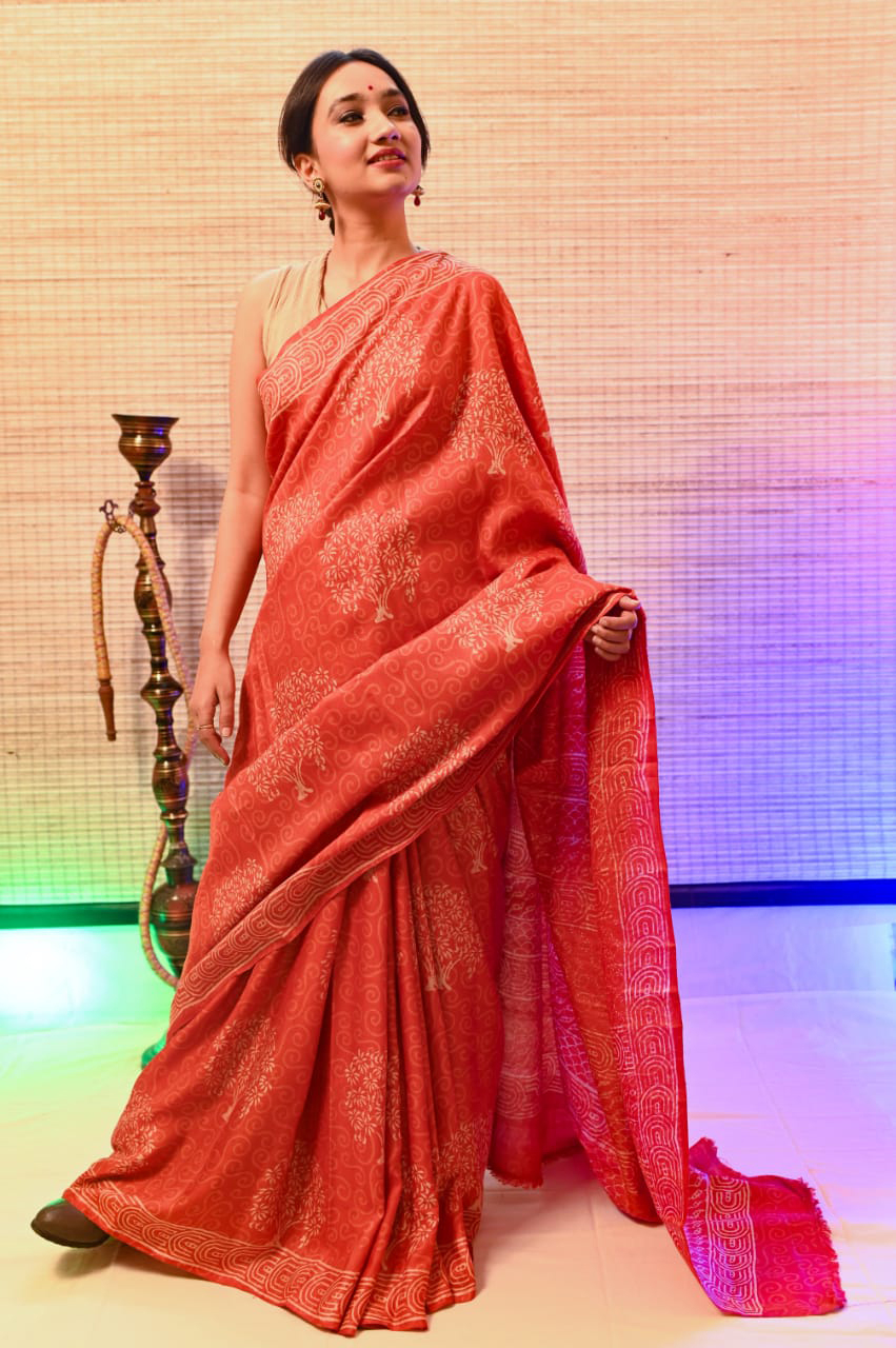 Hand Block Printed Saree on Pure Handloom Mulberry Silk Fabric