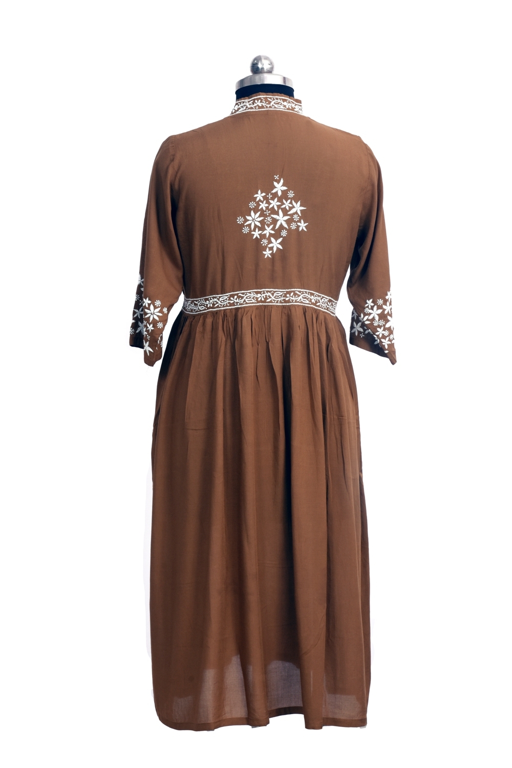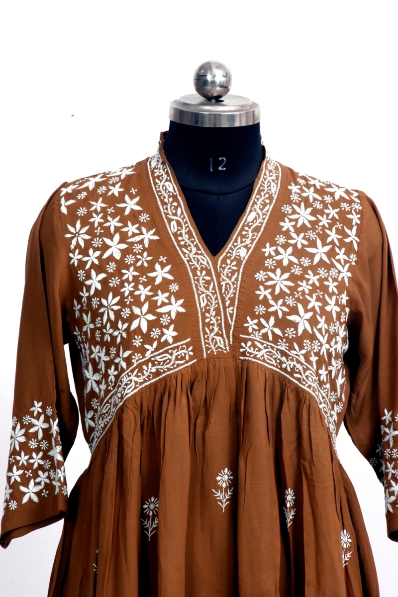Hand-Embroidered Chikankari Modal V Neck Kurti | Brown