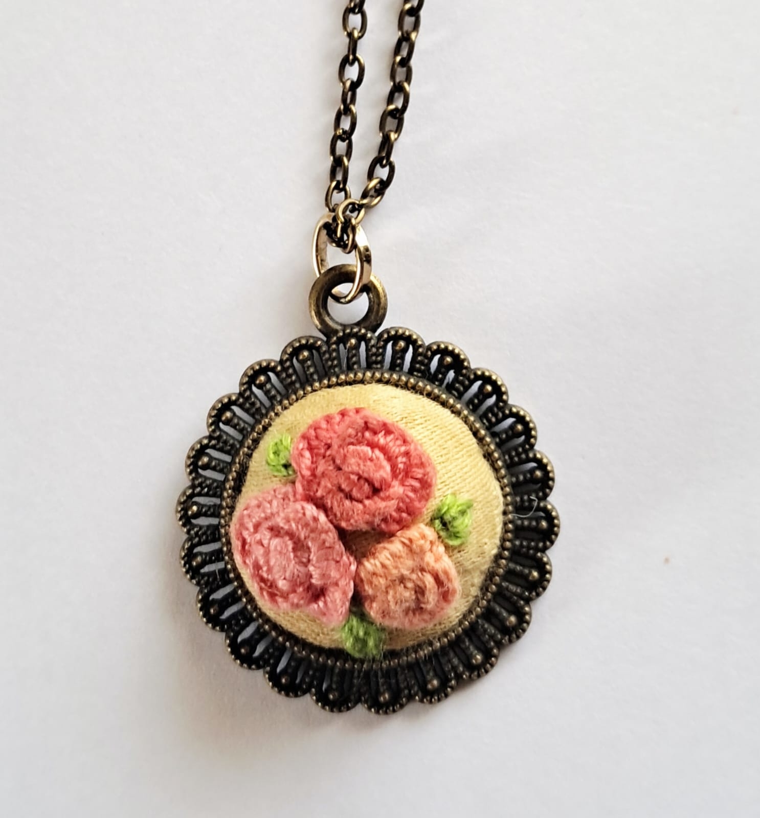 A handcrafted pendant featuring intricate hand embroidery on fabric, transforming traditional needlework into wearable art. Lightweight and unique, each piece is stitched with precision and care—perfect for adding artisanal charm to your style or gifting someone special.