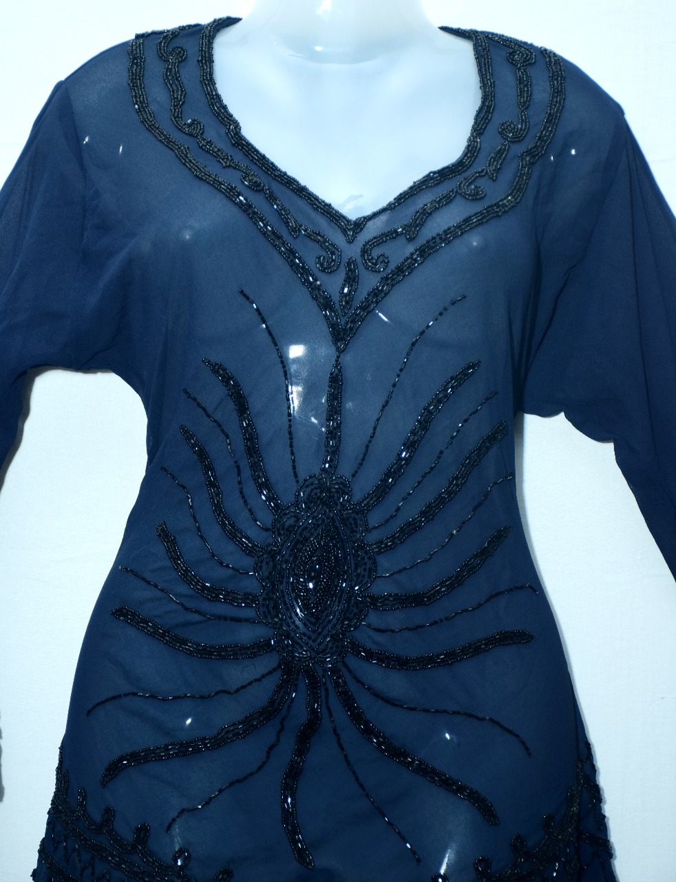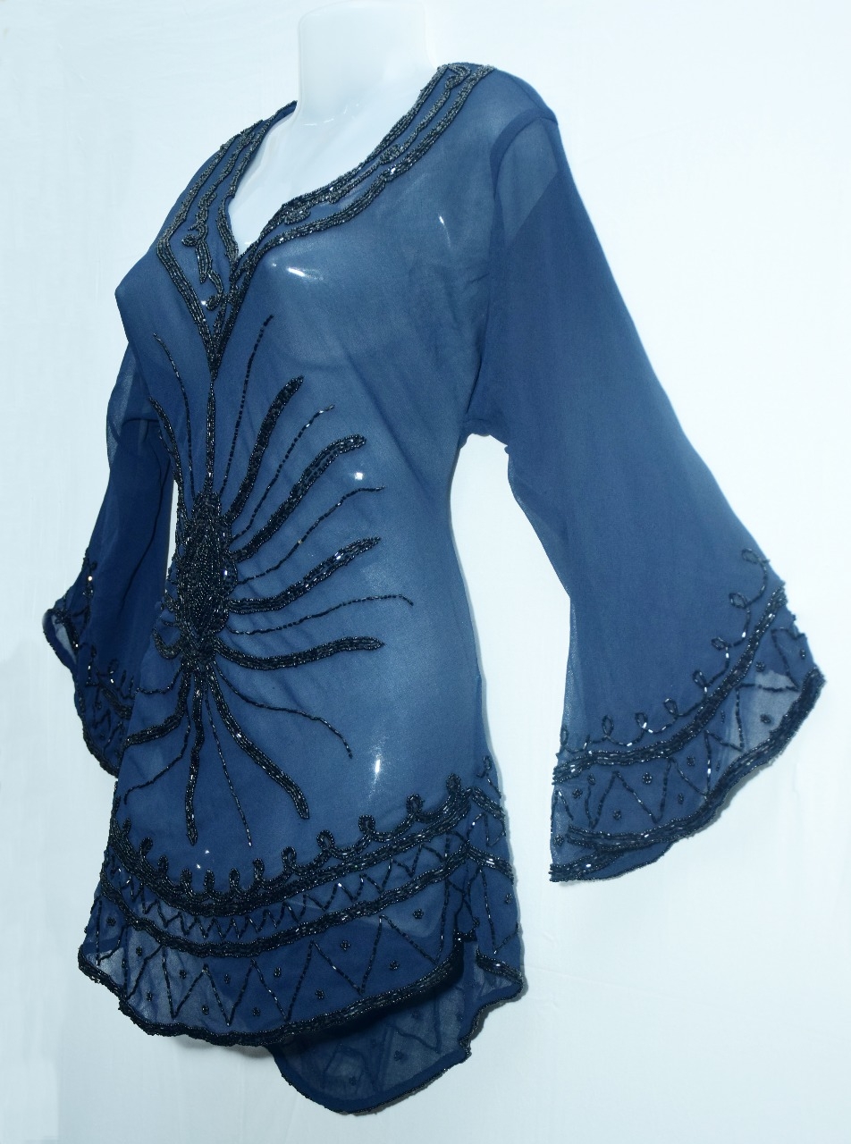 Elegant navy blue georgette tunic featuring intricate hand embroidery with black beads and sequins. Designed with a flattering V-neckline, flared sleeves, and a stylish curved hemline, this lightweight and flowy top is perfect for festive occasions, parties, or evening wear.