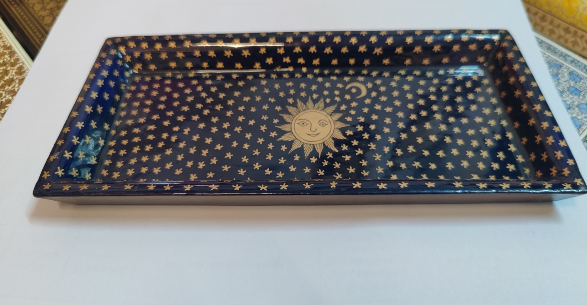 Bring the enchanting glow of a Himalayan night into your home with this exquisite, hand-painted wooden tray from the valley of Kashmir. Masterfully crafted by local artisans, this rectangular serving piece is more than just a utility item—it is a canvas showcasing generations of traditional skill. The tray features a deep, midnight blue lacquer finish that serves as a stunning backdrop for the intricate gold-tone motifs. At its heart lies a beautifully rendered celestial sun, radiating warmth and character, accompanied by a delicate crescent moon. Surrounding these central figures is a dense "field of stars," meticulously hand-dotted across the entire surface and inner rim, creating a mesmerizing telescopic effect.