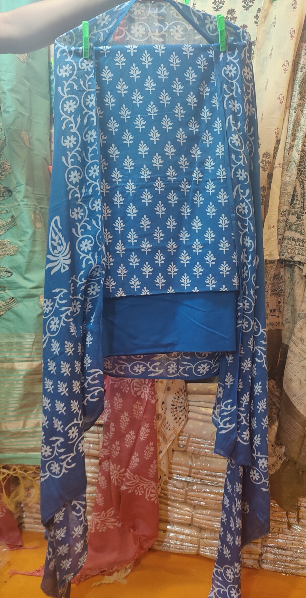 Bring a touch of serene elegance to your wardrobe with this beautifully crafted artisanal suit set. Each piece reflects the meticulous work of skilled artisans, celebrating the unique variations of hand-printed textiles. Experience the timeless beauty of traditional Indian block printing with our Indigo Floral Unstitched Suit Set. This ensemble is a perfect choice for the modern woman who values artisanal heritage and custom-tailored comfort. The highlight of this set is its sophisticated indigo and white palette, featuring a delicate all-over floral sprig pattern. The kurta fabric is complemented by a matching dupatta that showcases a more intricate border and floral motifs, creating a cohesive and graceful aesthetic. The deep blue solid-colored fabric for the bottoms provides a perfect anchor to the printed top.