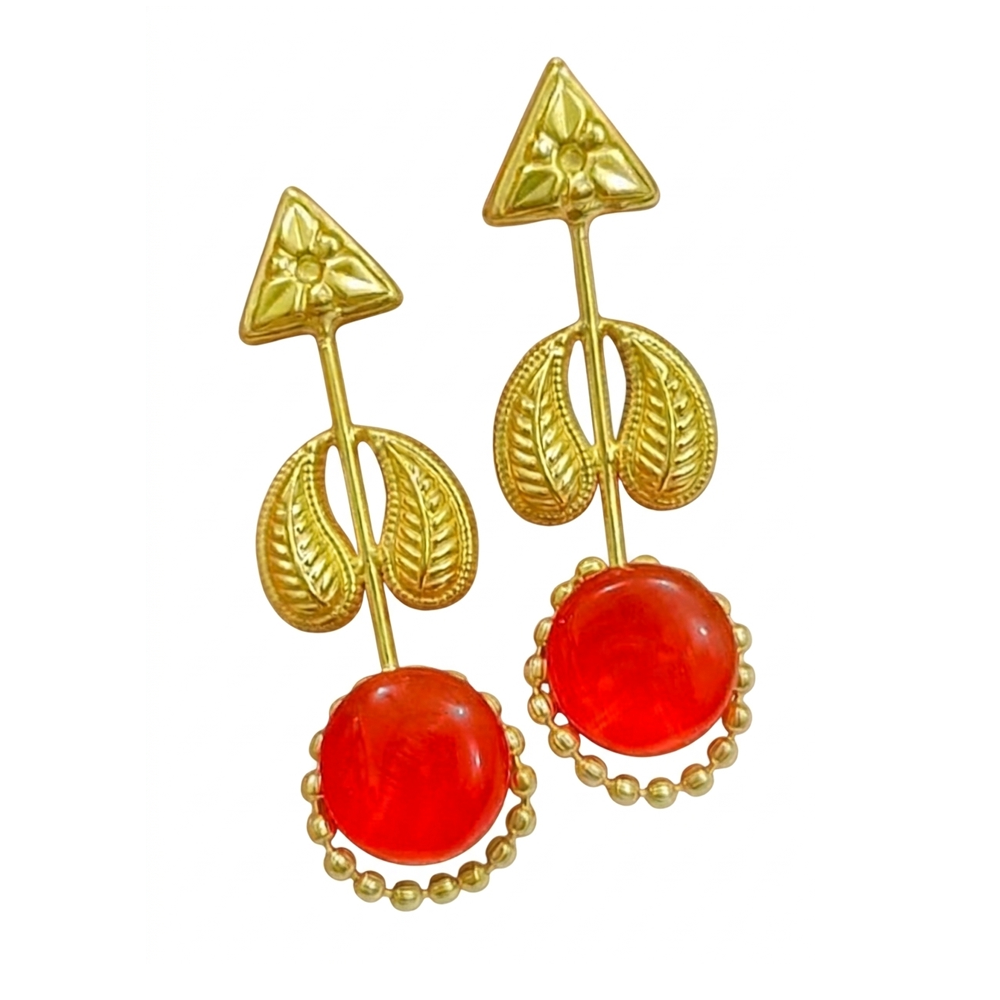 Elevate your style with these gold plated brass earrings featuring a vibrant red Monalisa stone. Designed with a unique leaf motif and elegant drop style, they offer a perfect blend of tradition and modern charm. Lightweight, comfortable, and ideal for party, festive, or daily wear. A stylish statement piece for every occasion.