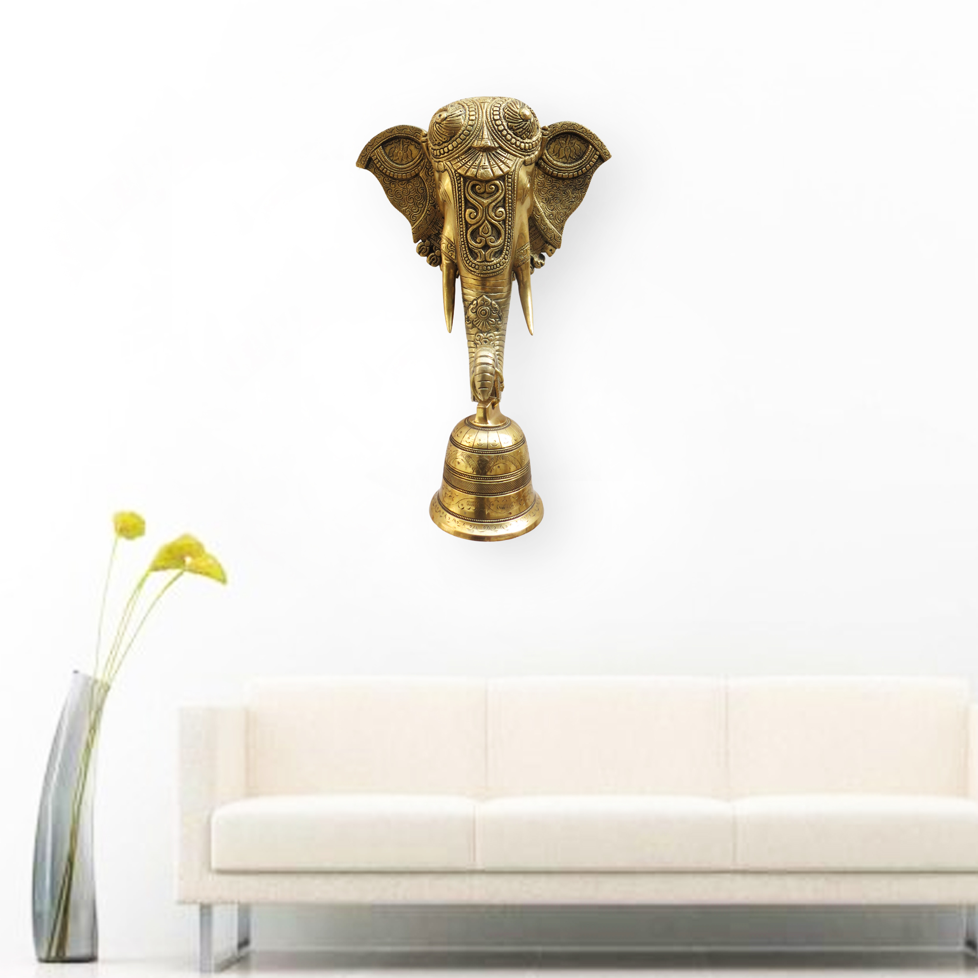 Handcrafted Brass Elephant Face Bell Hanging for Home Temple & Wall Decor 15inch KBH08093