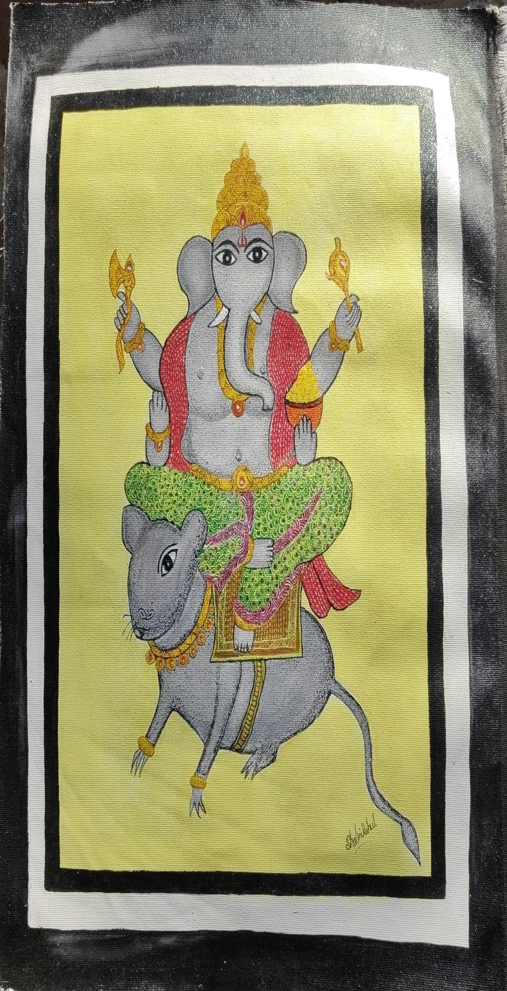 Bring home the "Remover of Obstacles" with this vibrant, hand-painted Ganesha Gond Art masterpiece. This authentic creation reimagines Lord Ganesha through the lens of one of India's most celebrated tribal art forms, blending spiritual reverence with the rhythmic, nature-inspired patterns of the Gond community. This piece uniquely highlights the bond between Ganesha and his vahana (mount), the mouse, depicted with the same intricate detailing and majesty as the deity himself. Every element—from Ganesha's crown to the mouse's body—is filled with the meticulously hand-drawn "dots and lines" and scale-like patterns that characterize traditional Gond work. Set against a luminous yellow background, Ganesha is adorned in regal shades of red and green, symbolizing prosperity and new beginnings. Painted on textured canvas and bearing the artist’s signature, this is a one-of-a-kind artifact of cultural storytelling.