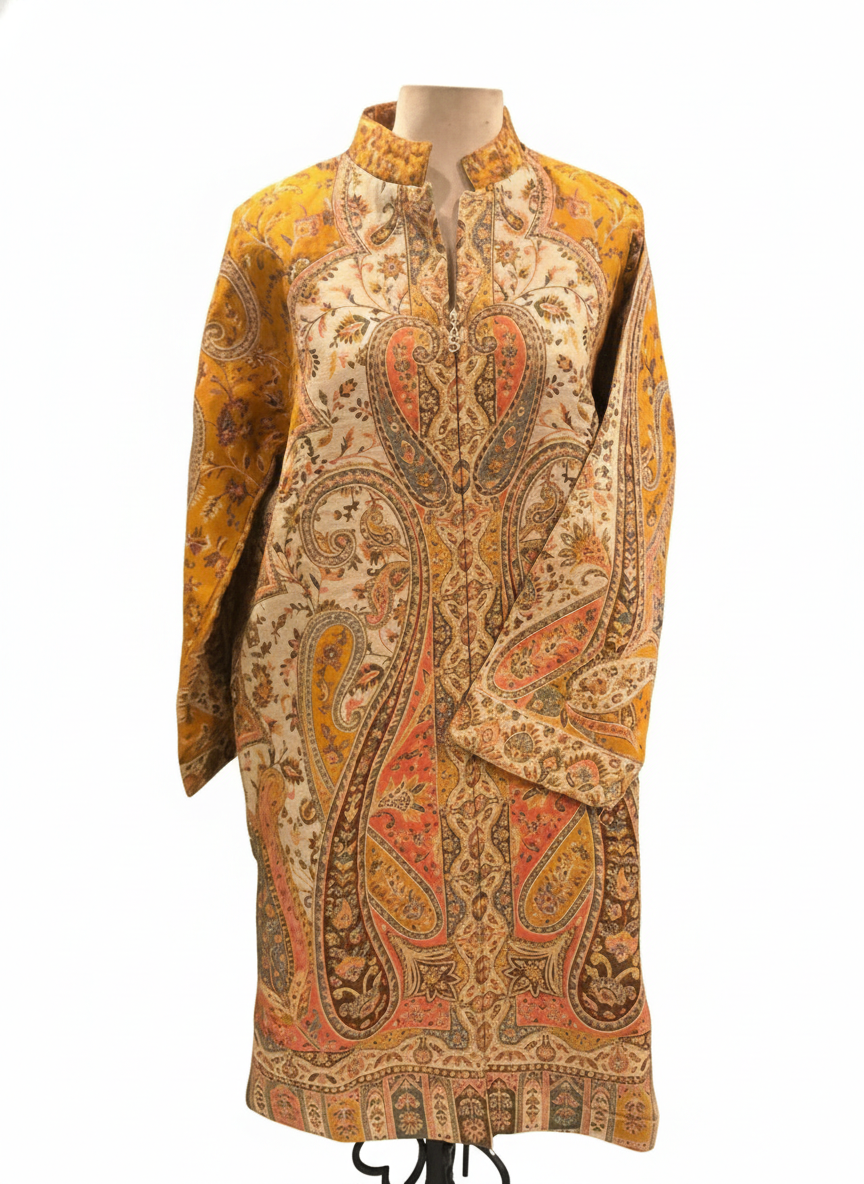 Adorned with the iconic Paisley (Buta) and floral motifs, this coat showcases a rich palette of ochre gold, terracotta, and muted earthy tones. Every inch of the fabric is densely woven, reflecting a meticulous attention to detail that only human hands can achieve. The high mandarin collar and sleek hidden placket offer a clean, sophisticated look, allowing the vibrant tapestry of the weave to take center stage.