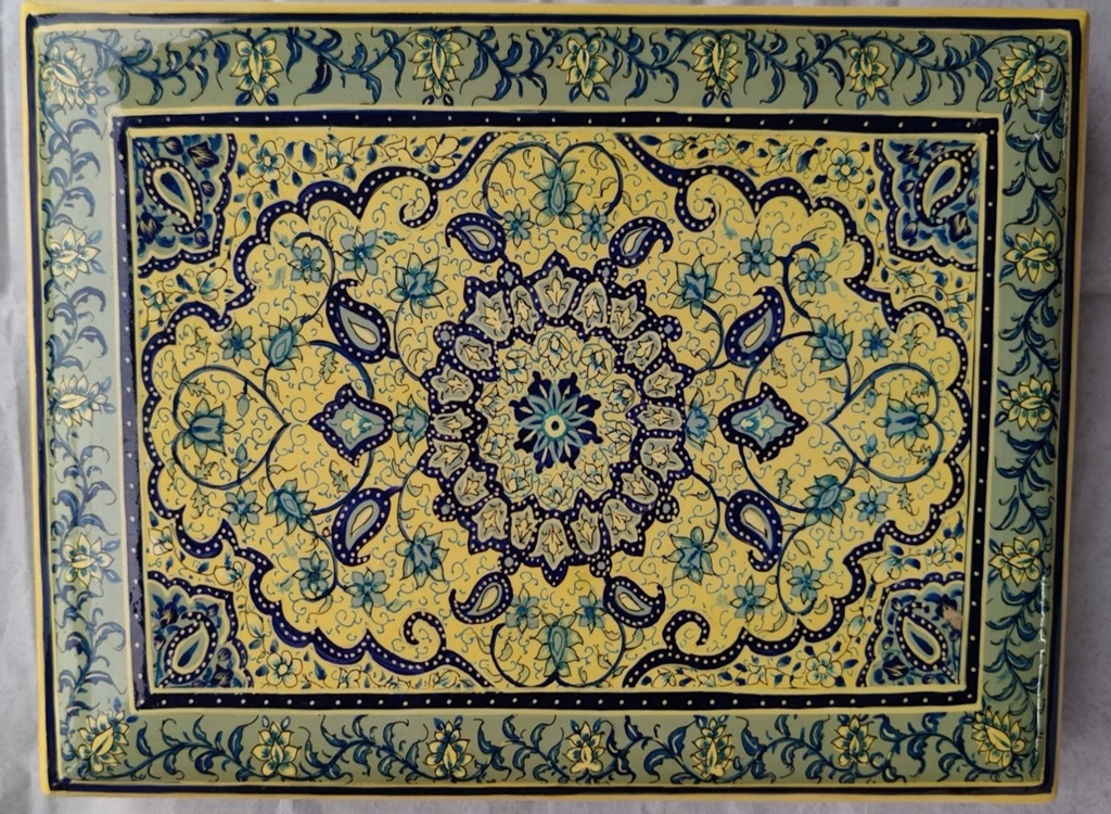 The lid is decorated with a complex, detailed Mandala-style floral motif in striking shades of vibrant yellow, deep navy blue, and teal. This detailed artwork, known as Naqashi, is entirely hand-painted by skilled artisans, ensuring that each box is a unique masterpiece. The sides feature complementary geometric and vine patterns, maintaining a cohesive and luxurious look.