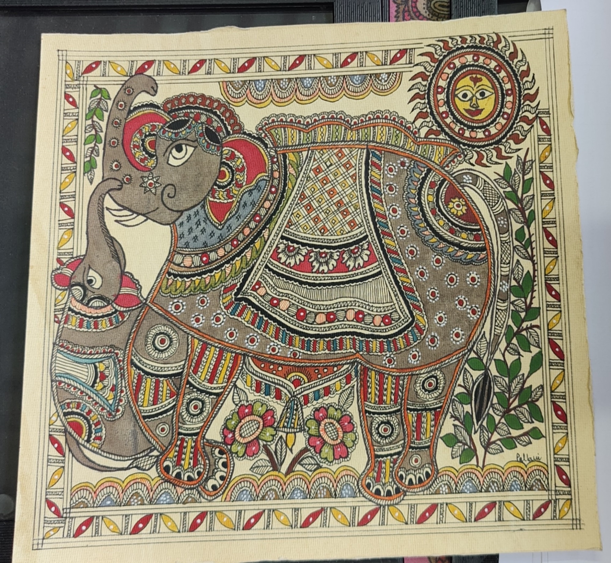 This piece features a majestic elephant, a symbol of wisdom and prosperity, rendered with the signature double-line border that defines the Madhubani style. Every inch of the canvas is filled with meticulous geometric "Katchni" (hatching) and "Bharni" (filling) techniques, ensuring no space is left empty—a hallmark of authentic Mithila art. Surrounding the central figure are traditional motifs of the sun, blooming lotuses, and stylized vines, representing life and cosmic energy.