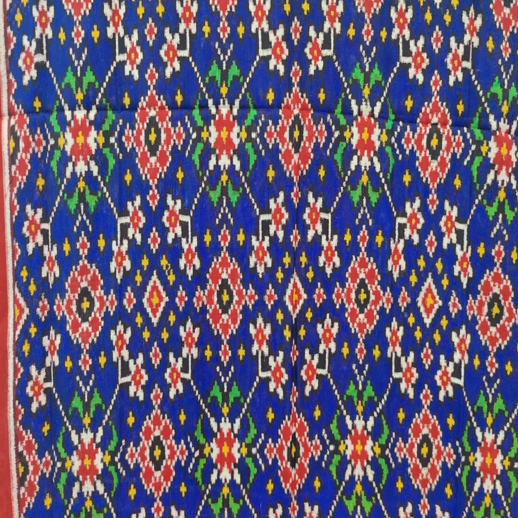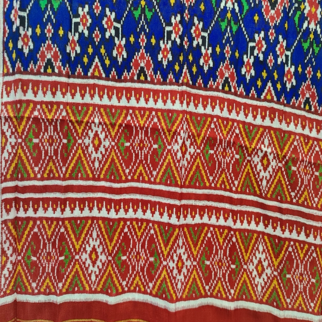 The dupatta features a rich royal blue base, adorned with an exquisite grid of geometric floral motifs in striking shades of red, white, and green. This complex pattern is a hallmark of traditional Patola design, symbolizing prosperity and good fortune. The border of the dupatta is a vibrant red, beautifully contrasted with golden yellow stripes and further embellished with an elaborate white and red patterned band, adding to its luxurious appeal. The craftsmanship involved in creating such a piece is incredibly time-consuming and requires immense skill, making each Patola dupatta a unique masterpiece. This handcrafted Patola Dupatta is not just an accessory; it's a wearable piece of art, perfect for adding a touch of traditional grandeur and sophisticated elegance to any ethnic ensemble. It represents a timeless legacy of Indian weaving, passed down through generations.