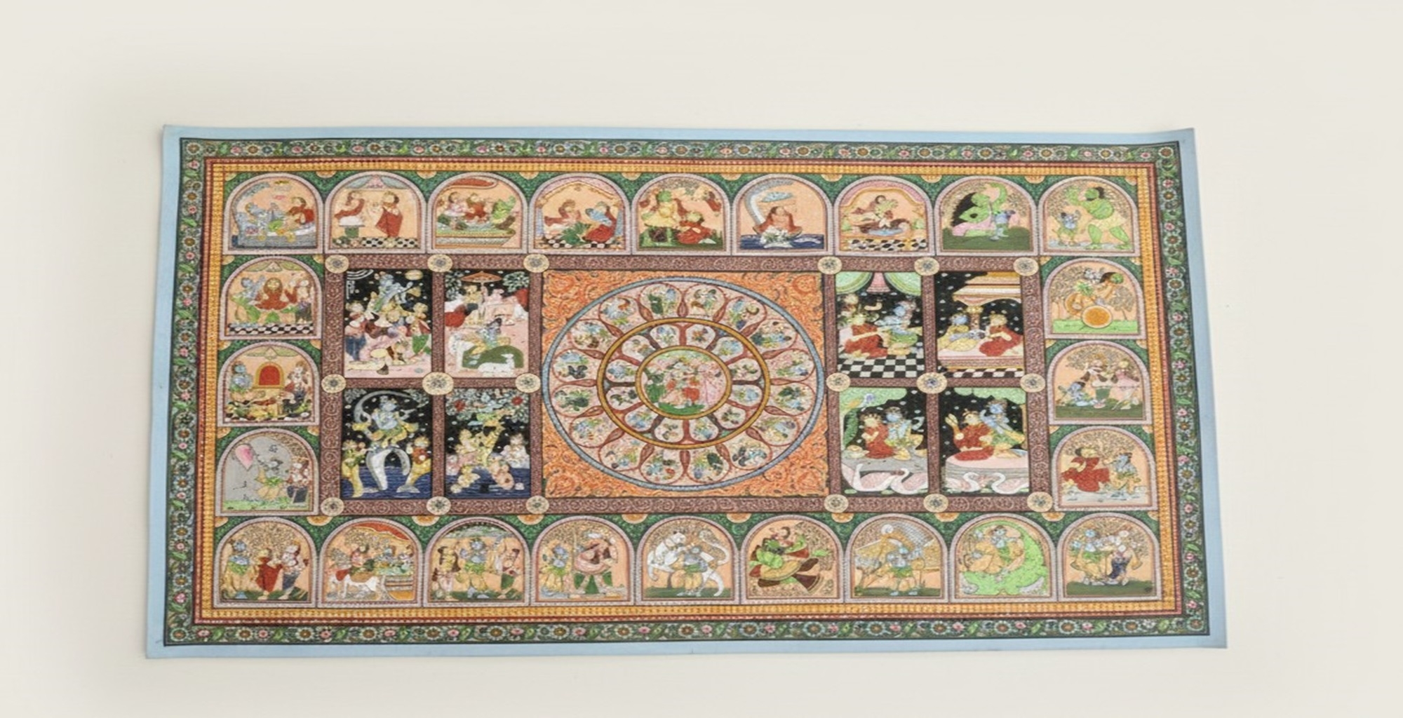 Sophisticated black-and-white compositions featuring elaborate mythological scenes framed by circular medallions and ornate floral borders. Richly colored panoramas using natural pigments to depict the life of Lord Krishna, the Dashavatara, and various celestial deities. True to tradition, every millimeter of the canvas is filled with rhythmic patterns, stylized foliage, and delicate line work, ensuring a captivating visual density.