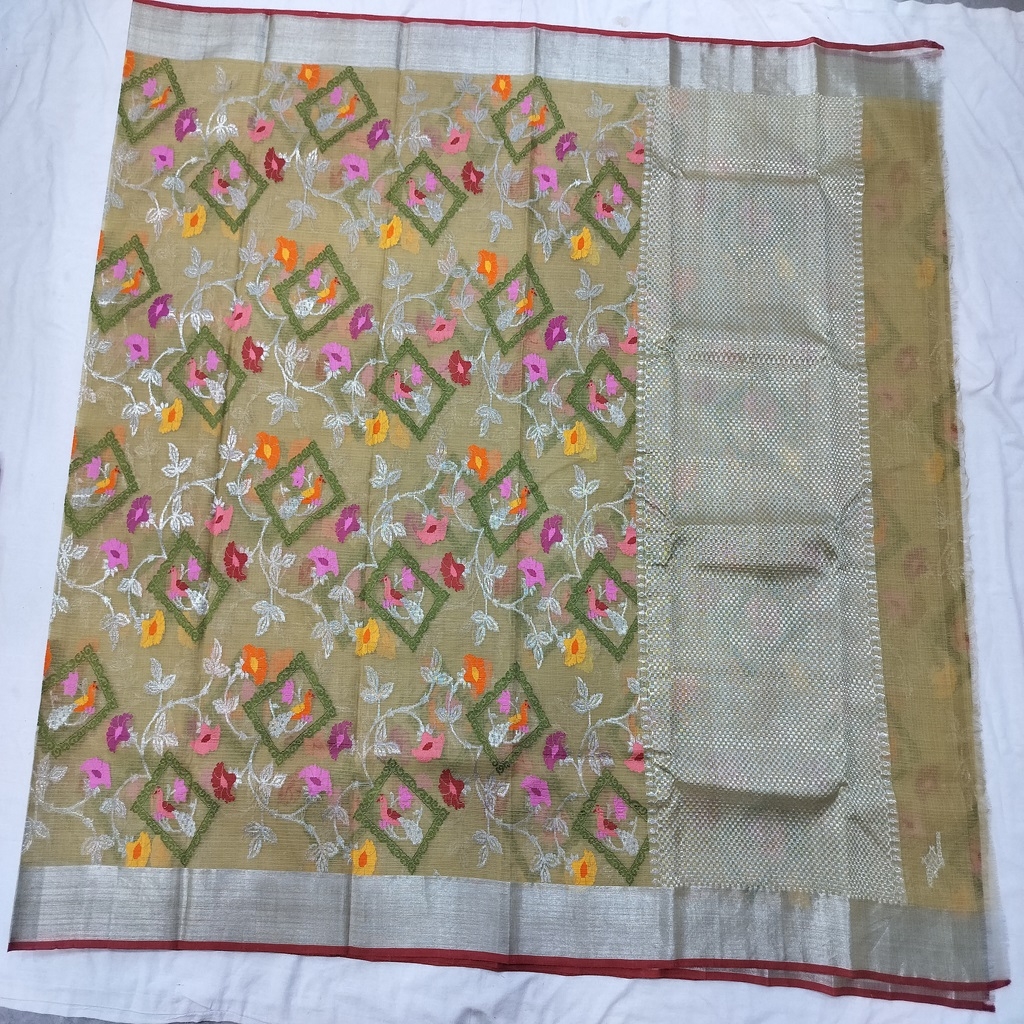 The saree's base color is a beautiful, muted beige, providing a sophisticated canvas for the intricate designs. Its body is adorned with a delicate all-over pattern of colorful floral motifs in shades of green, yellow, pink, and orange, each encased within a light green, diamond-shaped grid. Small bird motifs are also woven throughout, adding a touch of nature's charm. The highlight of the saree is its broad, luxurious border and pallu, which are meticulously handwoven with genuine real zari threads, creating a rich, shimmering golden weave with a complex geometric pattern. This exquisite detailing adds a sense of timeless opulence and grandeur. This saree is a testament to the skill of master weavers, offering a blend of traditional elegance, contemporary design, and unparalleled luxury, making it ideal for weddings, festive occasions, and grand celebrations.