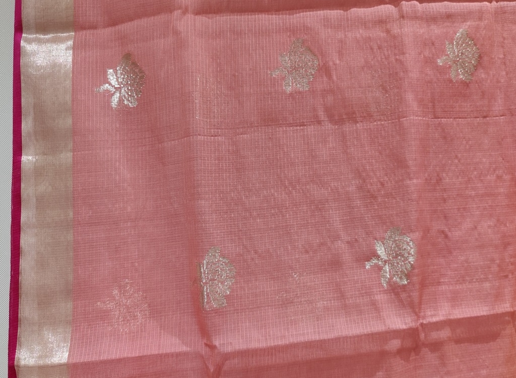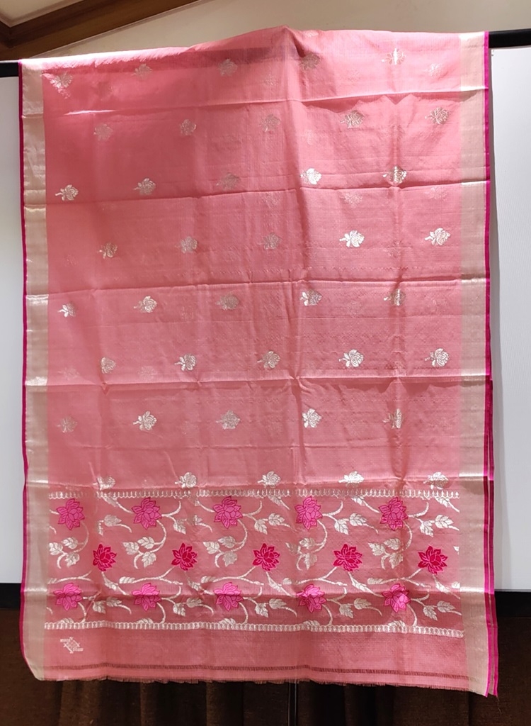 The beautiful pink hue serves as a soft canvas for the rich, traditional artistry. It is intricately adorned with real zari work, featuring delicate silver-toned buttis (motifs) scattered across the body, adding a subtle sparkle. The pallu and border truly elevate its beauty with a stunning floral pattern, showcasing vibrant pink blossoms contrasted with shimmering silver leaves and vines. The use of real zari threads is a testament to authentic craftsmanship, lending a luxurious texture and enduring brilliance that will be cherished for generations. This saree is a perfect blend of tradition, comfort, and heirloom quality.