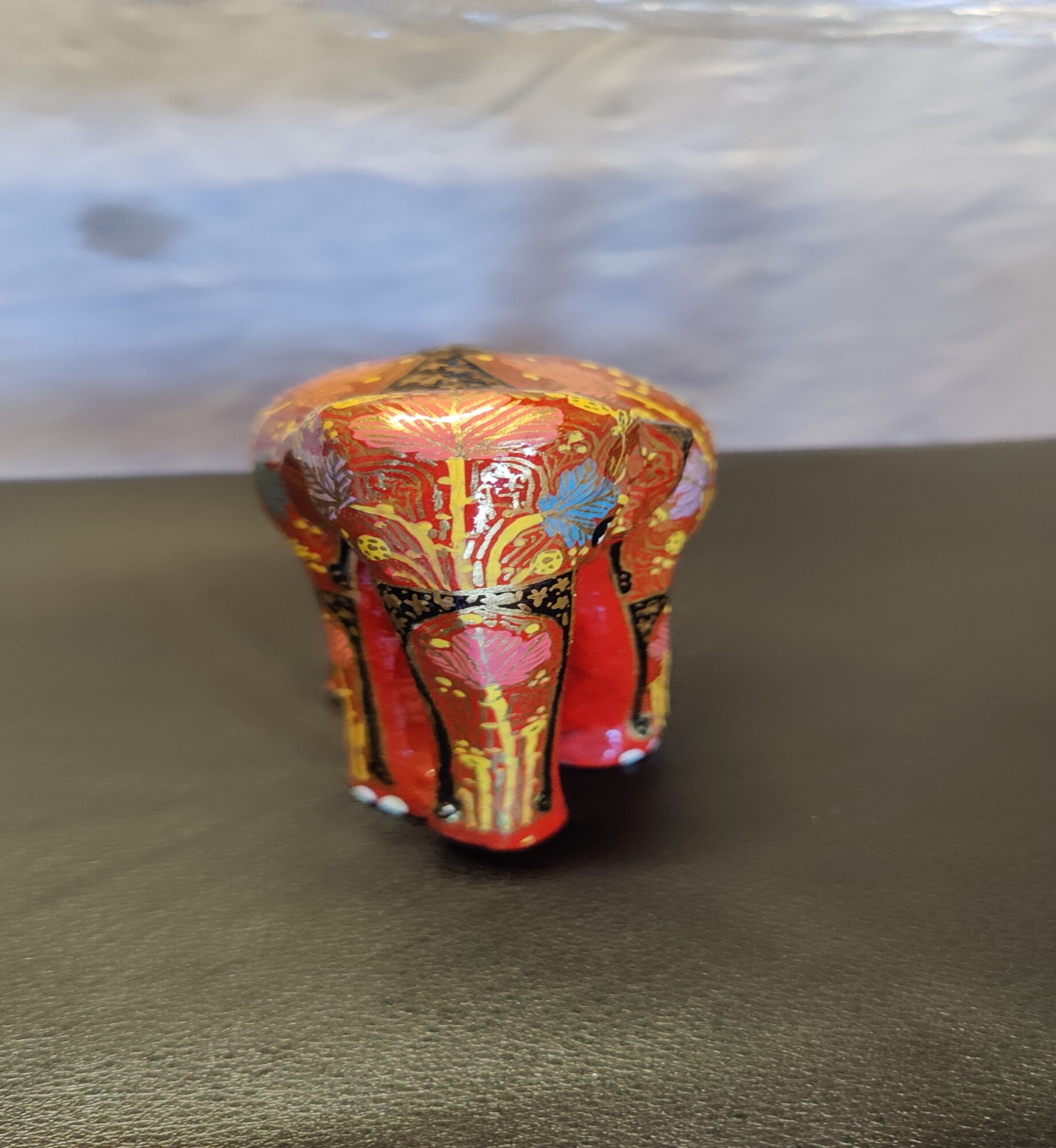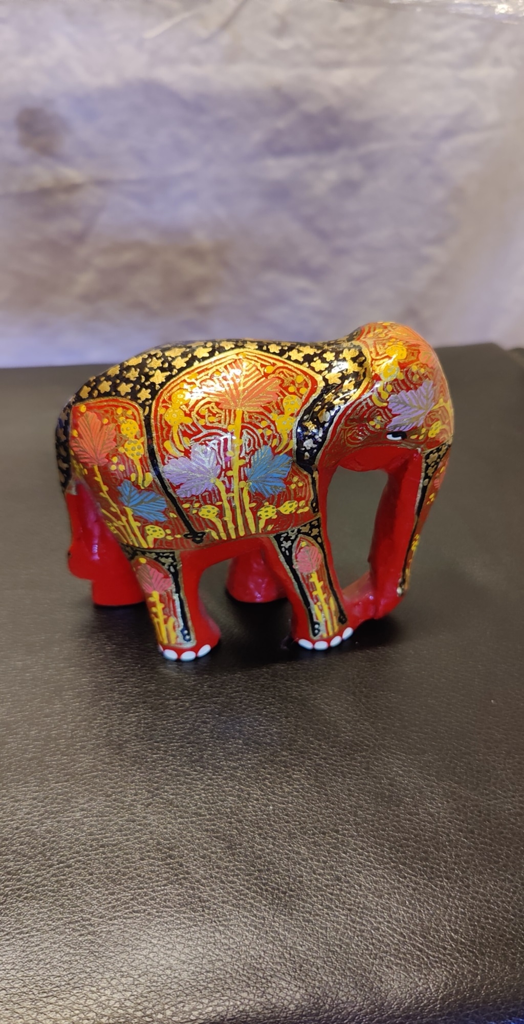 The elephant features a brilliant crimson red base, adorned with elaborate floral and leaf motifs in shimmering gold, turquoise, and soft pink.The trunk and forehead are decorated with traditional patterns that symbolize prosperity, strength, and good fortune, making it a meaningful addition to any space. Every stroke is applied by hand, ensuring that each piece is a unique work of art with its own distinct character.