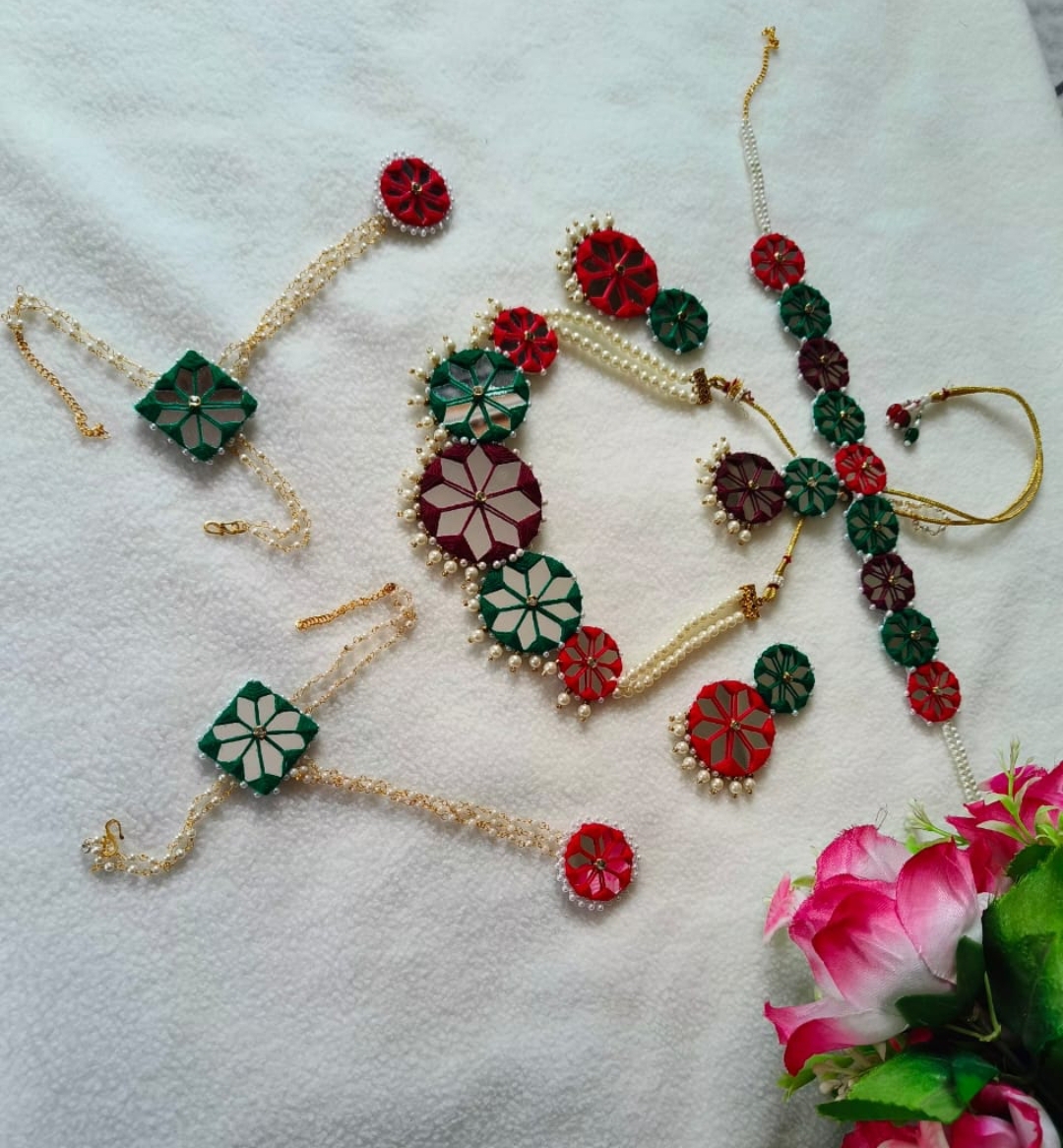 This beautifully handcrafted traditional jewellery set showcases a perfect blend of rich red and green tones with intricate mirror work and delicate pearl detailing. Designed to enhance ethnic outfits, the set includes a statement necklace, matching earrings, maang tikka, and hathphool. Lightweight yet striking, it offers comfort along with timeless elegance, making it an ideal choice for weddings, festivals, and special occasions. Crafted by skilled artisans, this jewellery reflects grace, tradition, and refined craftsmanship.
