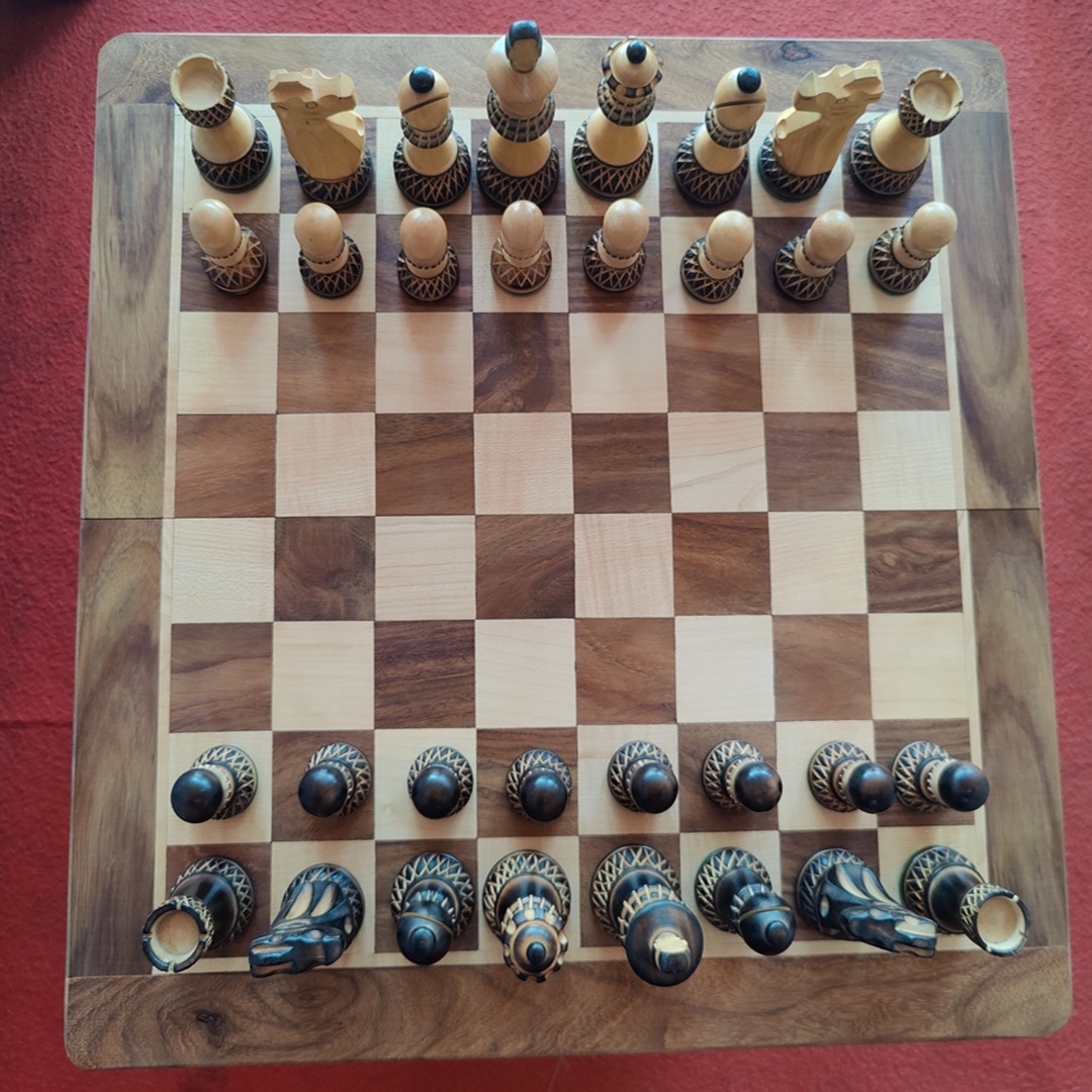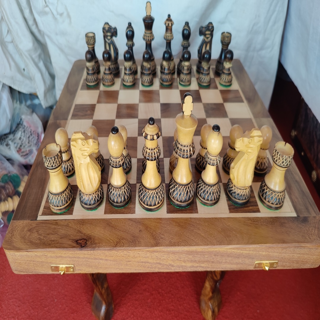 Experience the classic game of cunning and strategy with this Handcrafted Wooden Chess Board, which is the ideal fusion of style, robustness, and handcrafted craftsmanship. This chessboard is expertly crafted from high-quality wood, such as sheesham, and has a smooth, polished surface with meticulously inlaid squares that showcase the wood's rich natural grains. The set frequently includes exquisitely carved chess pieces that are individually designed to mirror traditional design and balance. These pieces provide a pleasant tactile sensation and a comfortable grip. This chessboard lends a sense of tradition and elegance to any area, whether it is used for lighthearted play, serious games, or as a chic décor element. This is more than just a gaming board; it's a piece of handcrafted legacy, making it perfect for collectors, chess enthusiasts, or thoughtful gift-giving.