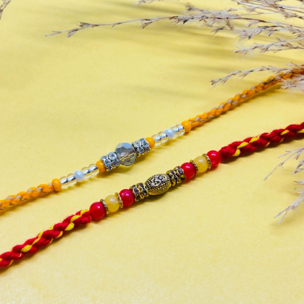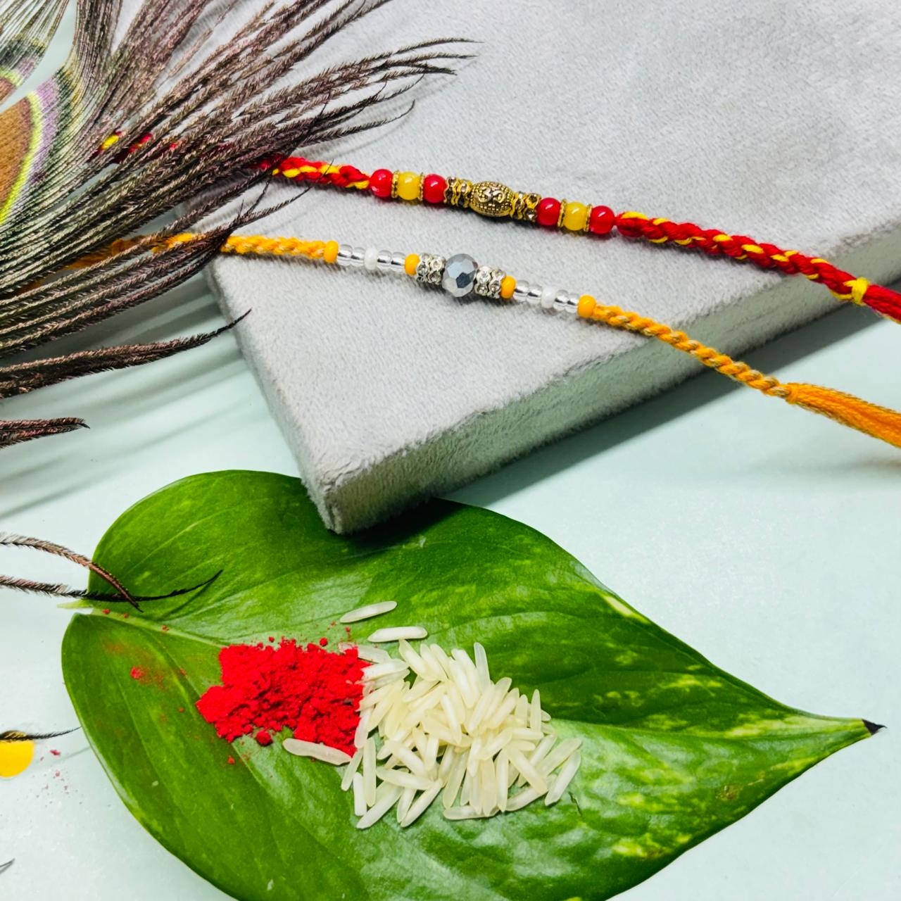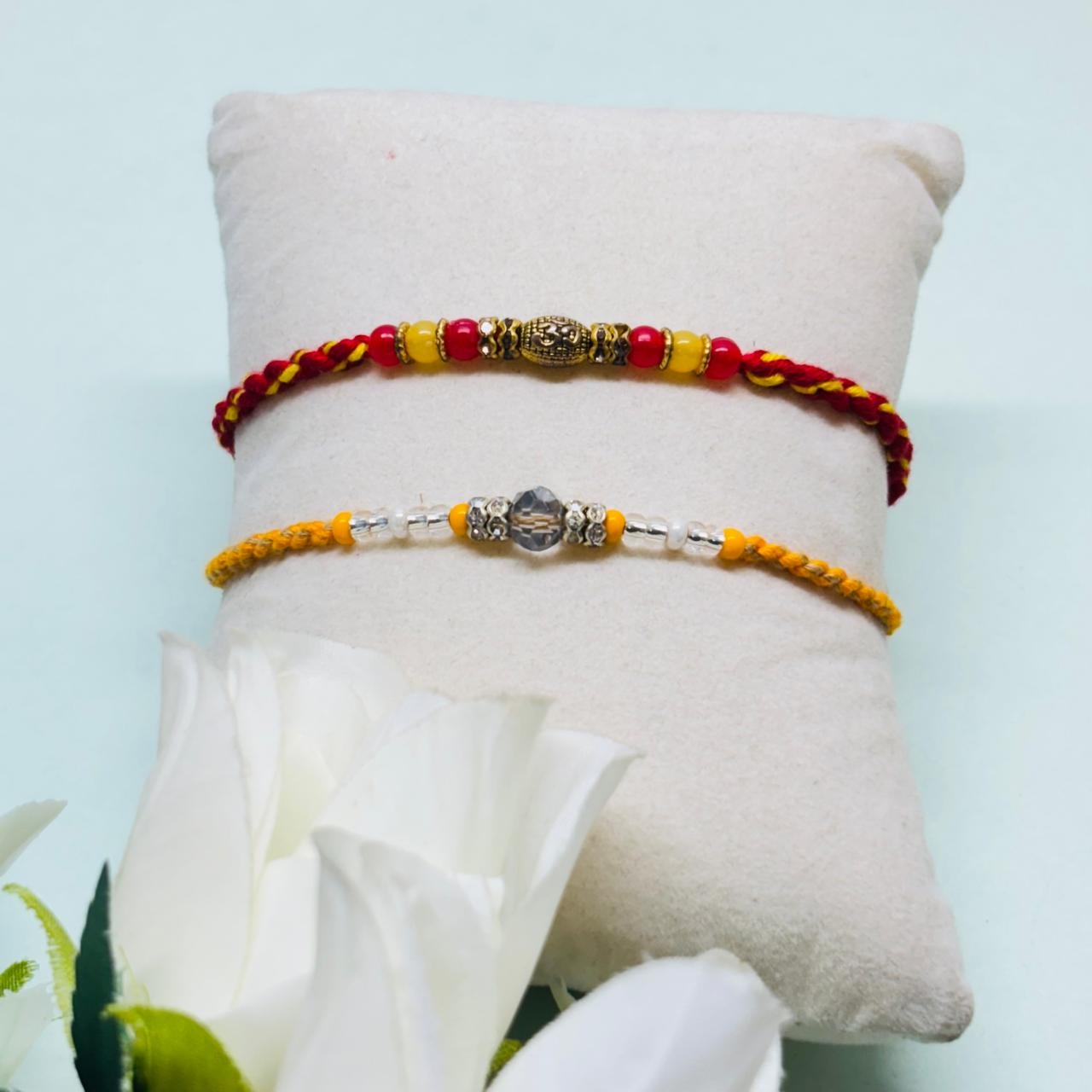 Handcrafted designer Rakhi set featuring two intricately braided wool threads and artisanal beadwork. The first Rakhi combines vibrant red and yellow braids, adorned with matching colored beads and a metallic gold bead for a festive touch. The second Rakhi showcases a sunny yellow braid centered with a crystal-style bead, complemented by smaller white and blue beads. Made from skin‑friendly wool, each Rakhi is artisan‑crafted, blending traditional braiding with contemporary bead accents to celebrate the bond of sibling love in style