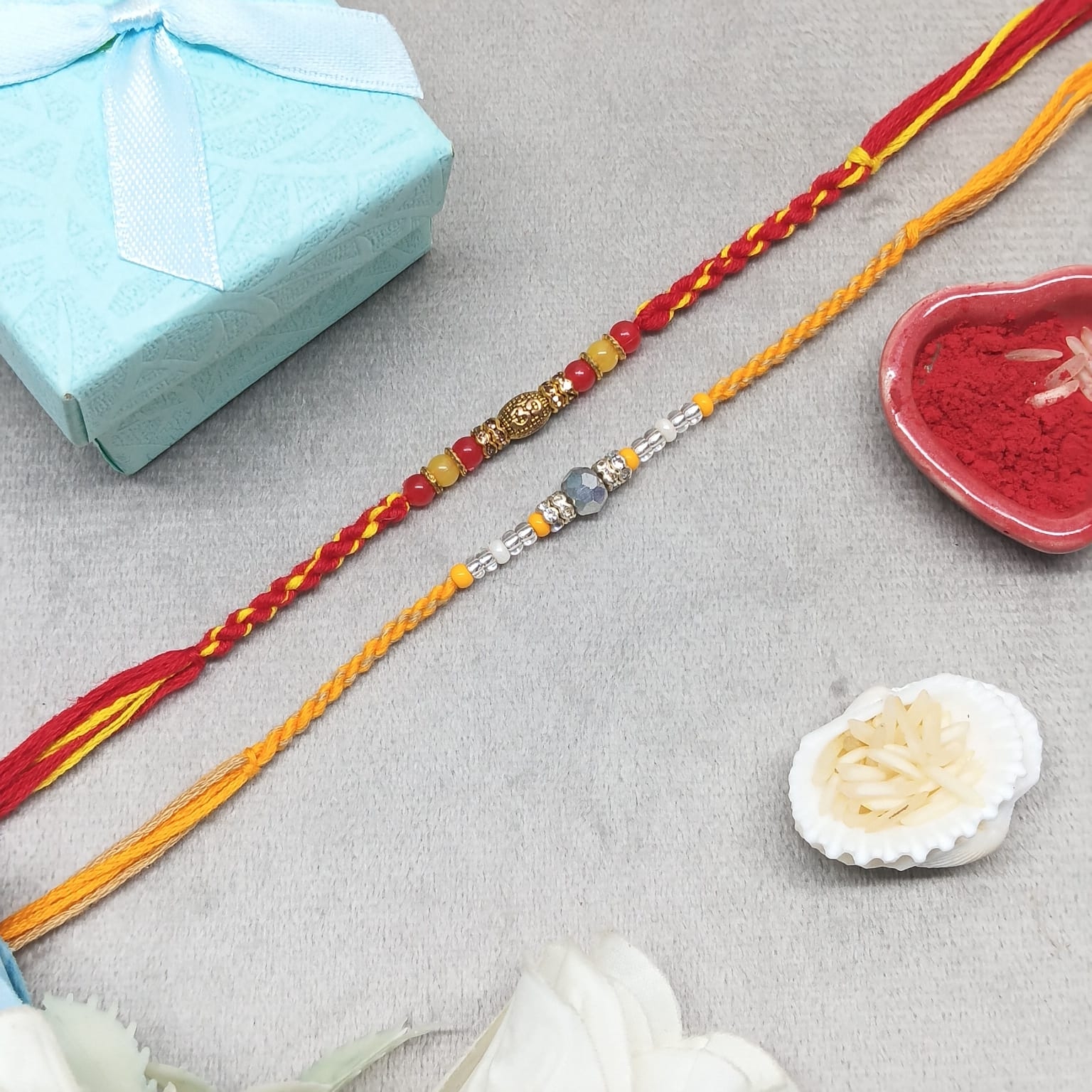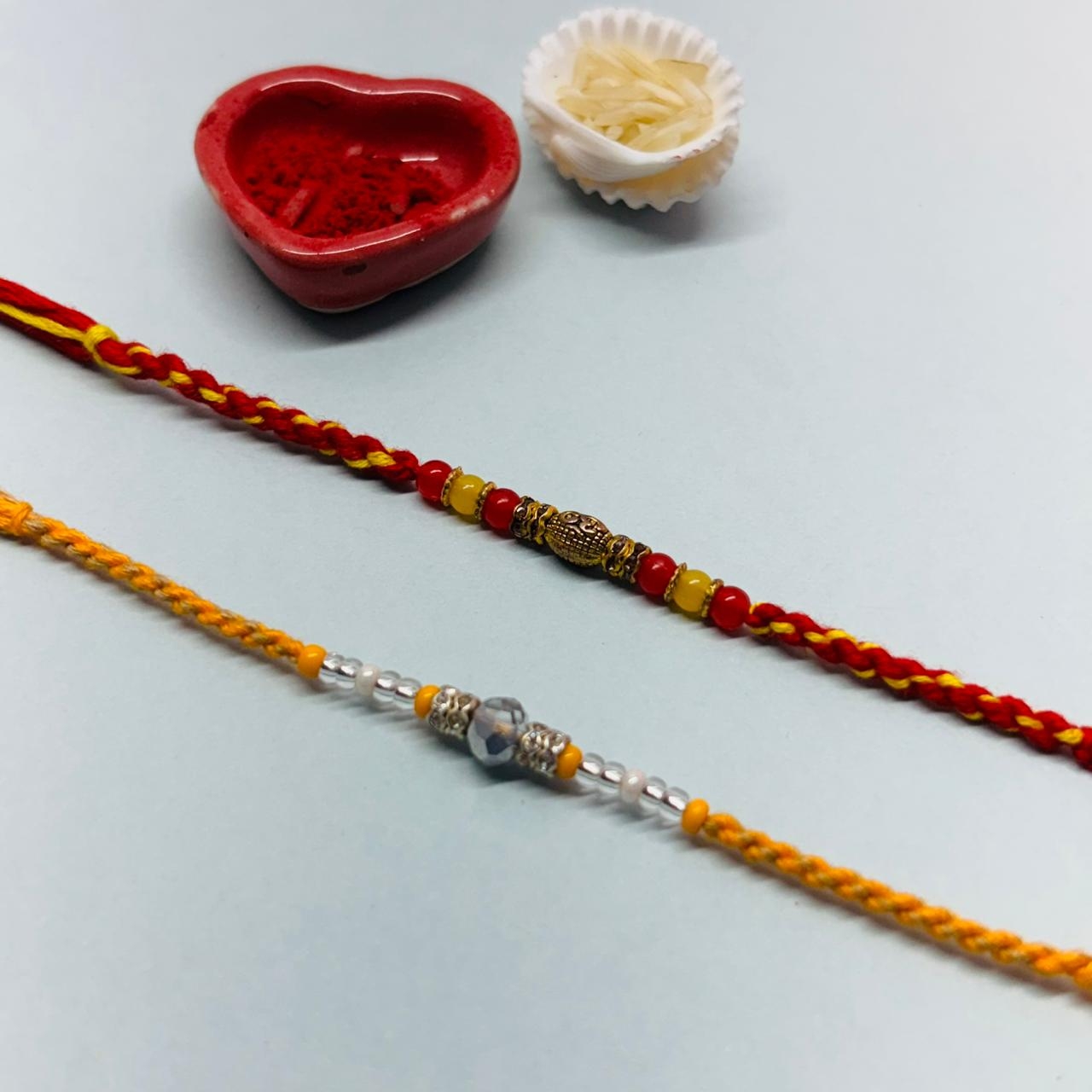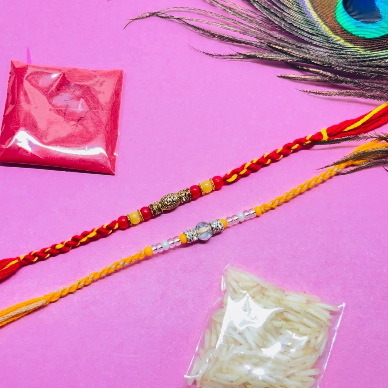 Handcrafted designer Rakhi set featuring two intricately braided wool threads and artisanal beadwork. The first Rakhi combines vibrant red and yellow braids, adorned with matching colored beads and a metallic gold bead for a festive touch. The second Rakhi showcases a sunny yellow braid centered with a crystal-style bead, complemented by smaller white and blue beads. Made from skin‑friendly wool, each Rakhi is artisan‑crafted, blending traditional braiding with contemporary bead accents to celebrate the bond of sibling love in style