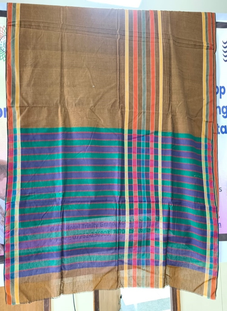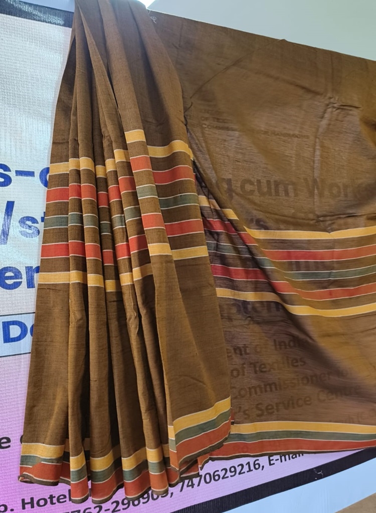 The saree features a rich earthy brown body, providing a versatile and sophisticated base. Its true highlight lies in the meticulously woven striped pallu and border, bursting with a lively palette of colors including vibrant reds, sunny yellows, deep greens, and striking purples. These contrasting stripes create a captivating visual appeal, showcasing the skill of the handloom weavers. Lightweight and easy to drape, this saree offers both style and ease. Its timeless design with contemporary color accents makes it a cherished addition to any wardrobe. Pair it with simple jewelry for a day out or dress it up with ethnic accessories for festive occasions. Celebrate the legacy of Indian handlooms with this exquisite cotton creation.