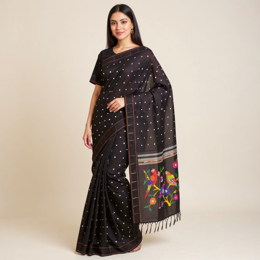 Woven Single Muniya PaithaniA Traditional Single Muniya Paithani is a handwoven pure silk saree from Maharashtra featuring a single row of intricate, parrot-shaped (Muniya) motifs on the border, traditionally woven in the town of Yeola. This classic design uses vibrant silk and Zari threads, creating a beautiful, classic look suitable for weddings and festivals. Key features include the pure silk fabric, traditional weaving techniques, a Fancy pallu with complementary motifs, and the cultural significance of the Muniya bird