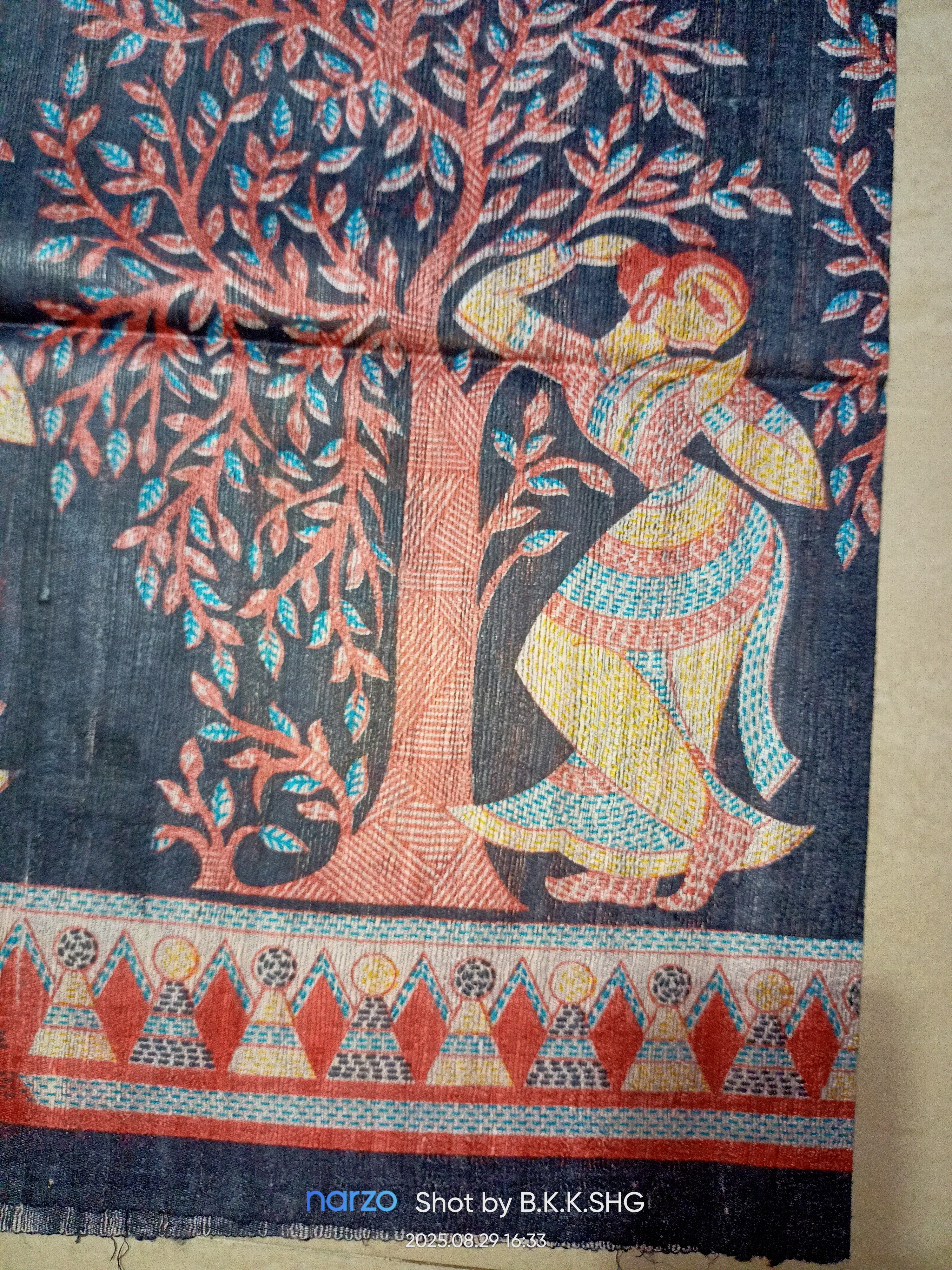 Tasar by ghicha madhubani screen print pure silk saree ,64 Reed 45 inch 6.30 c.m length