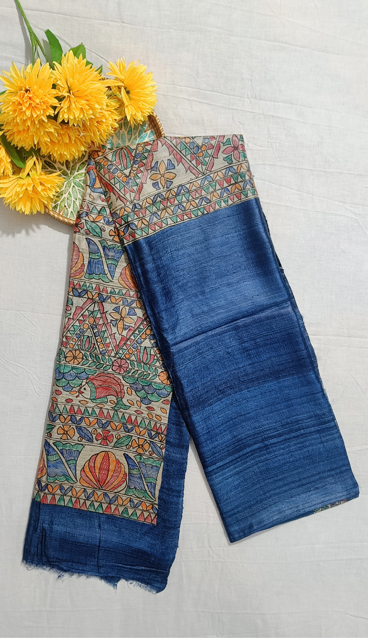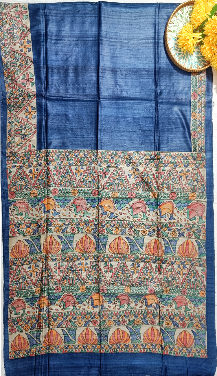 Handloom Tussar Silk Saree | Hand - Painted | Madhubani Art | Handwoven | Blue | Pure Silk Saree