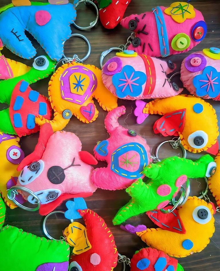 Add a touch of charm to your keys or bags with this adorable handmade felt bird keychain. Featuring vibrant colors, a stitched red wing, a purple tail, and a playful button eye, it's a fun and lightweight accessory that's perfect for gifting or personal use.