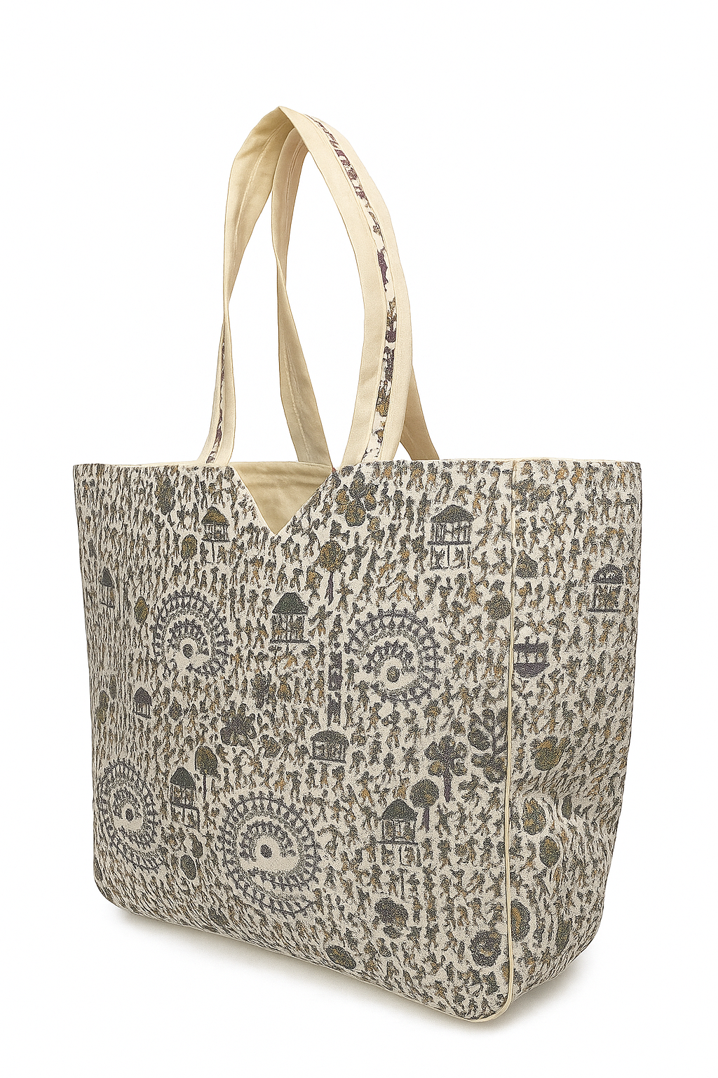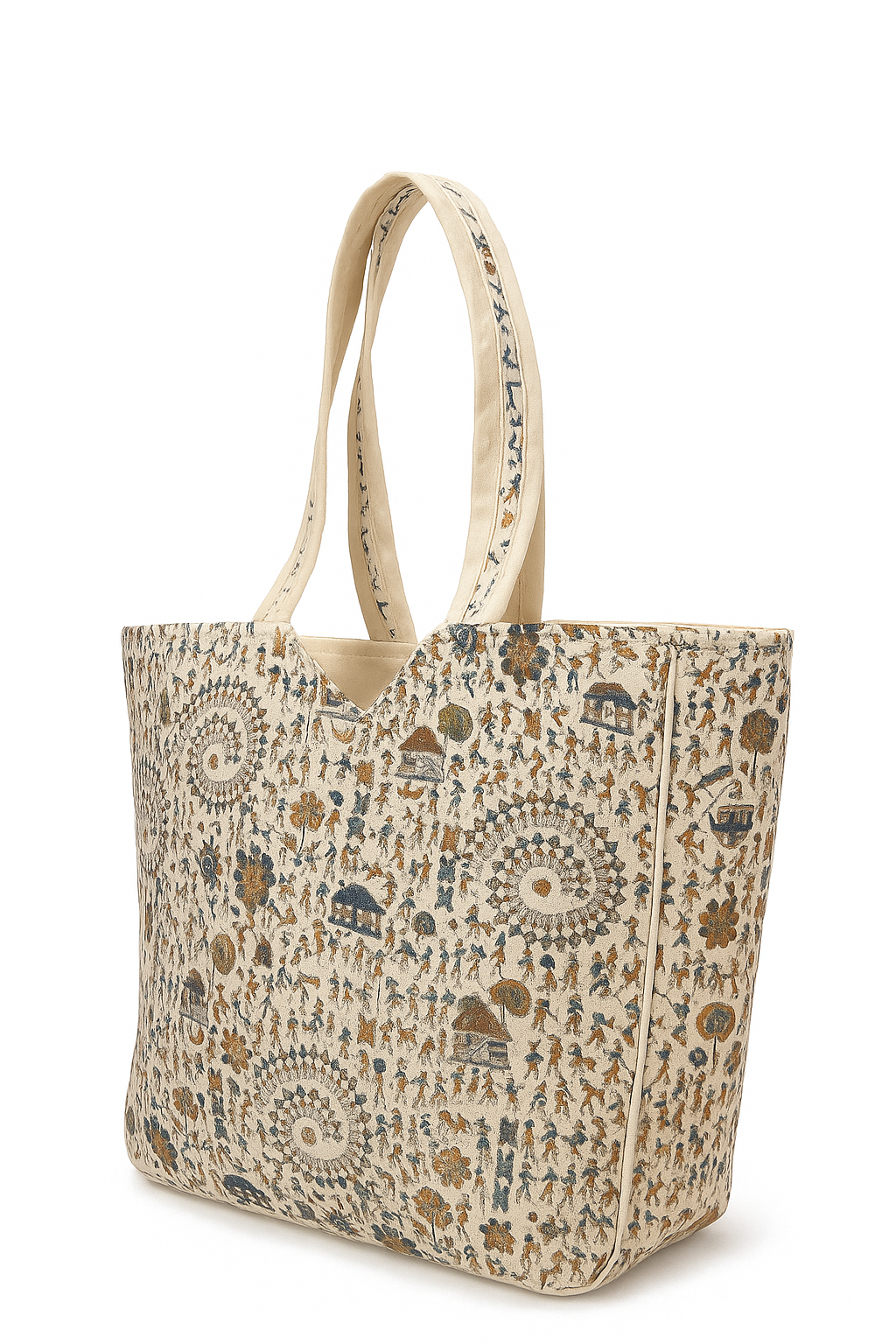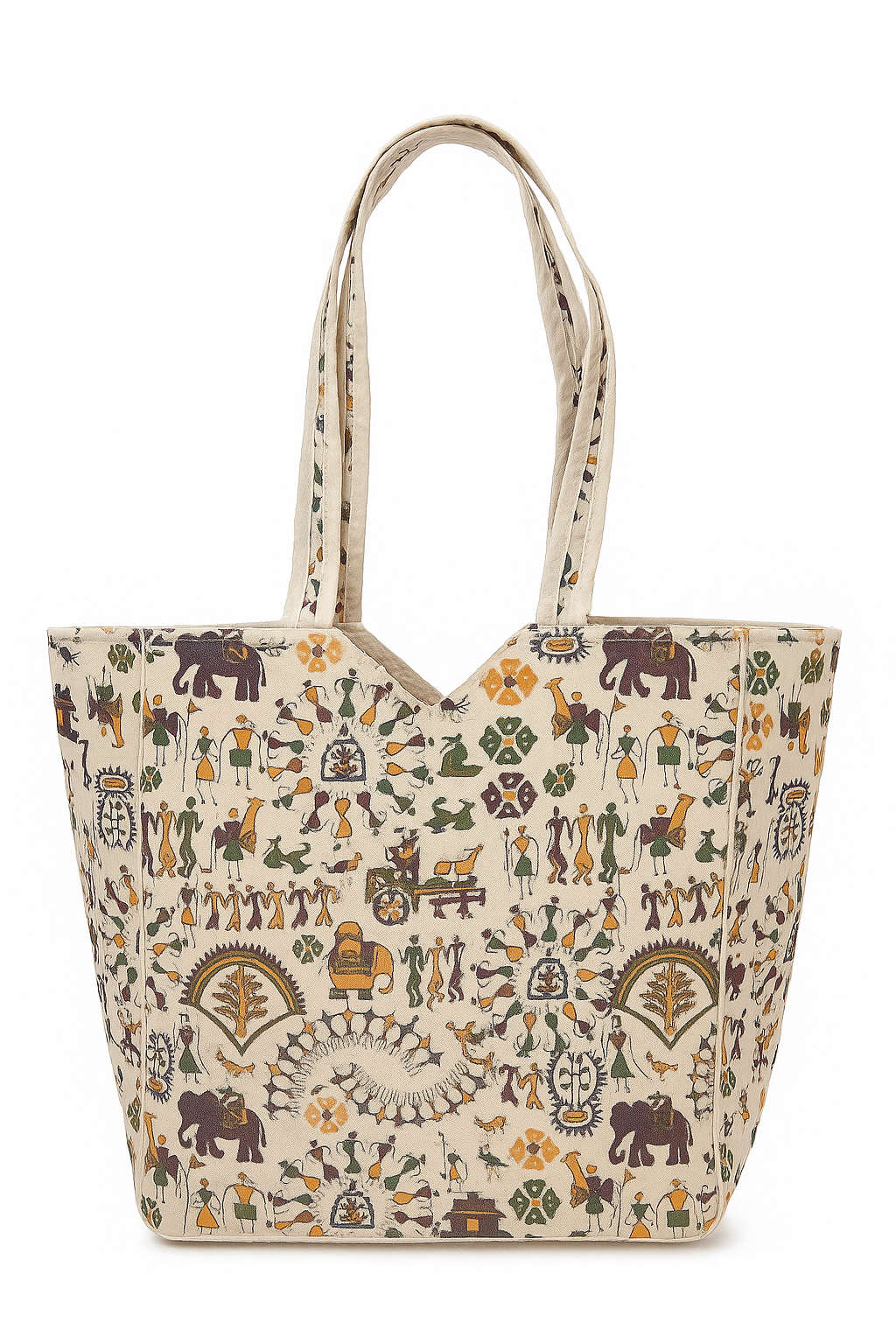 Add a touch of tradition and elegance to your everyday style with this Handcrafted Cotton Tote Bag featuring Applique Work and Tribal Warli Print. Made by skilled artisans, this eco-friendly bag beautifully blends culture with modern utility.