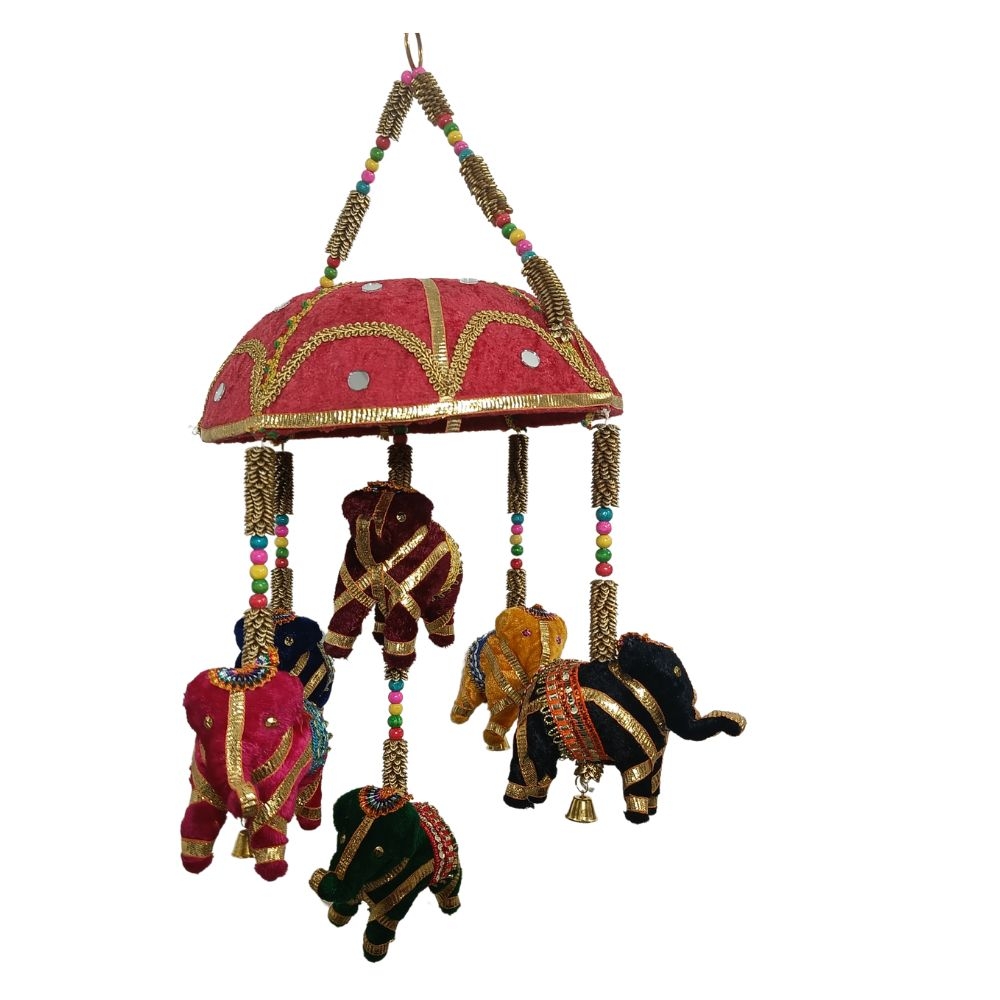 This jhumar features a circular tokri (basket) base adorned with vibrant fabric, mirror work. From the base hang miniature handcrafted elephants, each delicately decorated with traditional motifs, beads, and tiny bells. The elephants are suspended with strings of multicolored beads and thread tassels, giving the piece a lively and graceful movement.