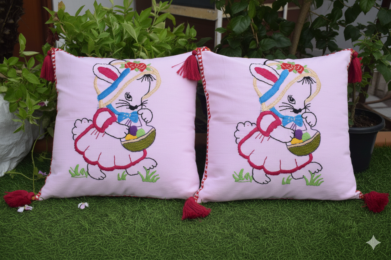 Add a touch of charm and elegance to your home décor with this beautifully handcrafted Bunny Embroidered Cushion Cover Set. Made from premium quality cotton fabric, these cushion covers feature intricate hand embroidery of a cute bunny design with colorful detailing and elegant tassel edges.